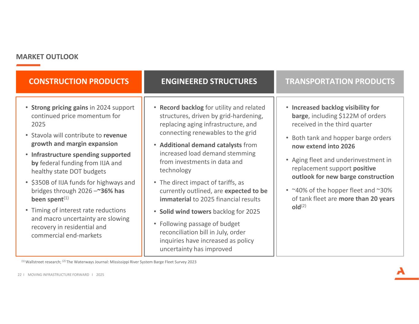 MARKET OUTLOOK CONSTRUCTION PRODUCTS ENGINEERED STRUCTURES TRANSPORTATION PRODUCTS 22 I MOVING INFRASTRUCTURE FORWARD I 2025 • Strong pricing gains in 2024 support continued price momentum for 2025 • Stavola will contribute to revenue growth and margin expansion • Infrastructure spending supported by federal funding from IIJA and healthy state DOT budgets • $350B of IIJA funds for highways and bridges through 2026 –~36% has been spent(1) • Timing of interest rate reductions and macro uncertainty are slowing recovery in residential and commercial end-markets • Record backlog for utility and related structures, driven by grid-hardening, replacing aging infrastructure, and connecting renewables to the grid • Additional demand catalysts from increased load demand stemming from investments in data and technology • The direct impact of tariffs, as currently outlined, are expected to be immaterial to 2025 financial results • Solid wind towers backlog for 2025 • Following passage of budget reconciliation bill in July, order inquiries have increased as policy uncertainty has improved • Increased backlog visibility for barge, including $122M of orders received in the third quarter • Both tank and hopper barge orders now extend into 2026 • Aging fleet and underinvestment in replacement support positive outlook for new barge construction • ~40% of the hopper fleet and ~30% of tank fleet are more than 20 years old(2) (1) Wallstreet research; (2) The Waterways Journal: Mississippi River System Barge Fleet Survey 2023