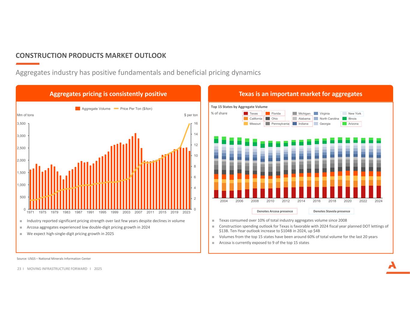 CONSTRUCTION PRODUCTS MARKET OUTLOOK 23 I MOVING INFRASTRUCTURE FORWARD I 2025 Source: USGS – National Minerals Information Center Aggregates industry has positive fundamentals and beneficial pricing dynamics Texas is an important market for aggregatesAggregates pricing is consistently positive ■ Industry reported significant pricing strength over last few years despite declines in volume ■ Arcosa aggregates experienced low double-digit pricing growth in 2024 ■ We expect high-single-digit pricing growth in 2025 Top 15 States by Aggregate Volume ■ Texas consumed over 10% of total industry aggregates volume since 2008 ■ Construction spending outlook for Texas is favorable with 2024 fiscal year planned DOT lettings of $13B. Ten-Year outlook increase to $104B in 2024, up $4B ■ Volumes from the top 15 states have been around 60% of total volume for the last 20 years ■ Arcosa is currently exposed to 9 of the top 15 states Denotes Arcosa presence Denotes Stavola presence % of share 0 2 4 6 8 10 12 14 16 0 500 1,000 1,500 2,000 2,500 3,000 3,500 Mm of tons $ per ton 1971 1975 1979 1983 1987 1991 1995 1999 2003 2007 2011 2015 2019 2023 Aggregate Volume Price Per Ton ($/ton) Texas California Missouri Florida Ohio Pennsylvania Michigan Alabama Indiana Virginia North Carolina Georgia New York Illinois Arizona 2004 2006 2008 2010 2012 2014 2016 2018 2020 2022 2024