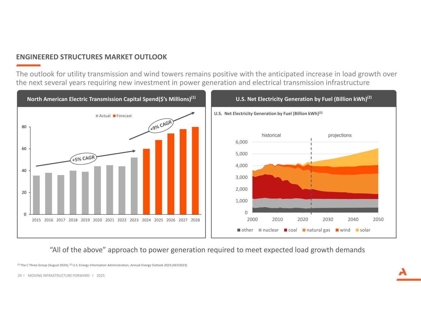 ENGINEERED STRUCTURES MARKET OUTLOOK 24 I MOVING INFRASTRUCTURE FORWARD I 2025 (1) The C Three Group (August 2024); (2) U.S. Energy Information Administration, Annual Energy Outlook 2023 (AEO2023) The outlook for utility transmission and wind towers remains positive with the anticipated increase in load growth over the next several years requiring new investment in power generation and electrical transmission infrastructure U.S. Net Electricity Generation by Fuel (Billion kWh)(2) Total U.S. and Canada Electric Transmission: Reported CAPEX ($B) North American Electric Transmission Capital Spend($’s Millions)(1) Total U.S. and Canada Electric Transmission: Reported CAPEX ($B) 0 20 40 60 80 2015 2016 2017 2018 2019 2020 2021 2022 2023 2024 2025 2026 2027 2028 Actual Forecast U.S. Net Electricity Generation by Fuel (Billion kWh)(2) 0 1,000 2,000 3,000 4,000 5,000 6,000 2000 2010 2020 2030 2040 2050 other nuclear coal natural gas wind solar historical projections “All of the above” approach to power generation required to meet expected load growth demands