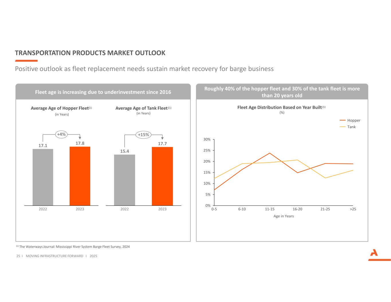 Total U.S. and Canada Electric Transmission: Reported CAPEX ($B) TRANSPORTATION PRODUCTS MARKET OUTLOOK 25 I MOVING INFRASTRUCTURE FORWARD I 2025 (1) The Waterways Journal: Mississippi River System Barge Fleet Survey, 2024 Positive outlook as fleet replacement needs sustain market recovery for barge business Roughly 40% of the hopper fleet and 30% of the tank fleet is more than 20 years old Total U.S. and Canada Electric Transmission: Reported CAPEX ($B) Fleet age is increasing due to underinvestment since 2016 17.1 17.8 2022 2023 +4% Average Age of Hopper Fleet(1) (in Years) 15.4 17.7 2022 2023 +15% Average Age of Tank Fleet (1) (in Years) 0% 5% 10% 15% 20% 25% 30% 0-5 6-10 11-15 16-20 21-25 >25 Hopper Tank Fleet Age Distribution Based on Year Built (1) (%) Age in Years