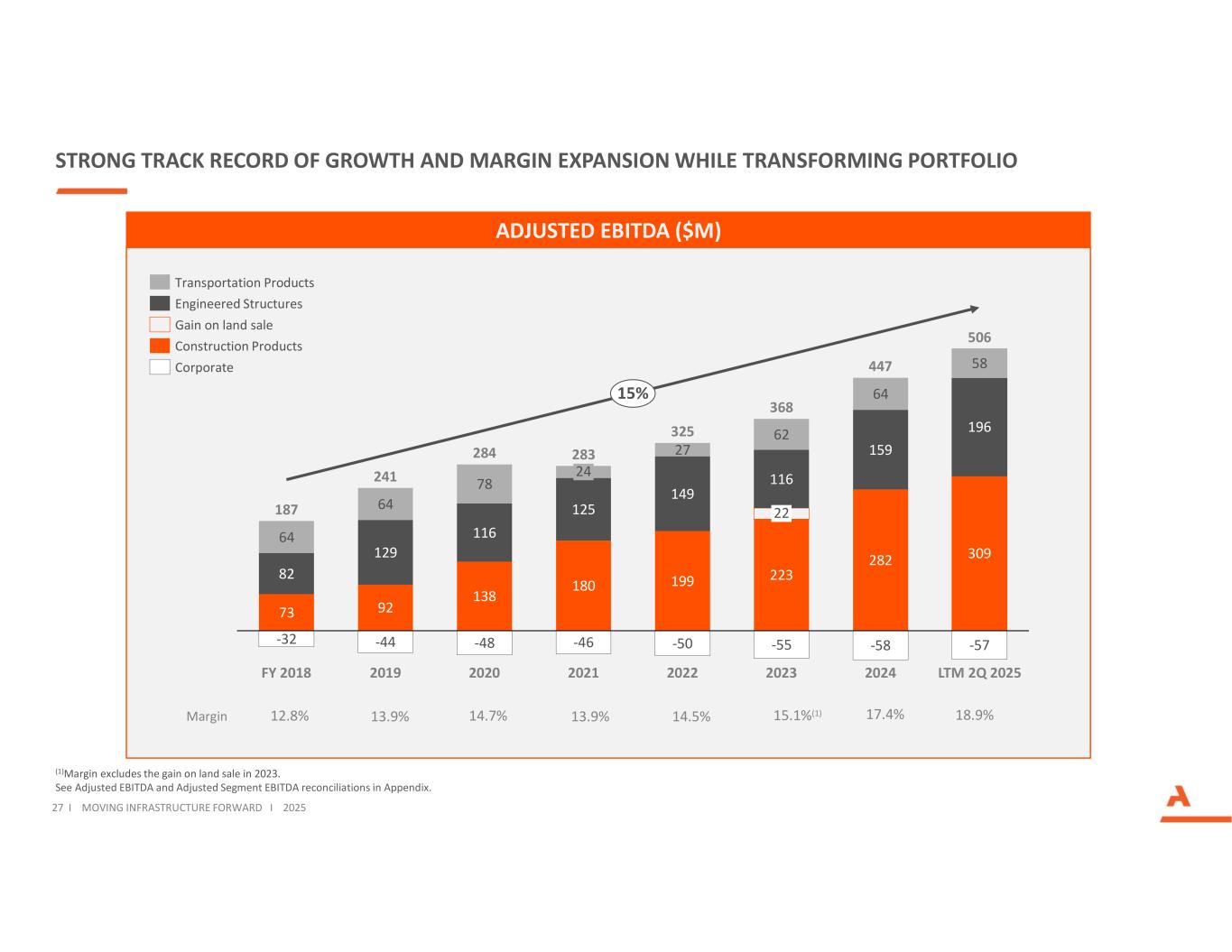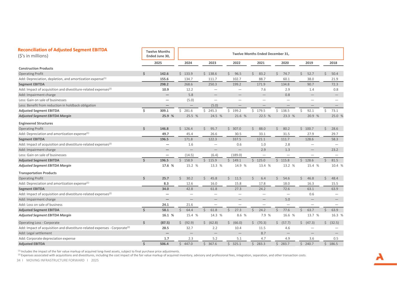 34 Moving Infrastructure ForwardI MOVING INFRASTRUCTURE FORWARD I 2025 Reconciliation of Adjusted Segment EBITDA (1) Includes the impact of the fair value markup of acquired long-lived assets, subject to final purchase price adjustments. (2) Expenses associated with acquisitions and divestitures, including the cost impact of the fair value markup of acquired inventory, advisory and professional fees, integration, separation, and other transaction costs. ($’s in millions) (unaudited) Twelve Months Ended December 31,Twelve Months Ended June 30, 20182019202020212022202320242025 Construction Products $ 50.4$ 52.7$ 74.7$ 83.2$ 96.5$ 138.6$ 133.9$ 142.6Operating Profit 21.938.060.188.7102.7111.7134.7155.6Add: Depreciation, depletion, and amortization expense(1) 72.390.7134.8171.9199.2250.3268.6298.2Segment EBITDA 0.81.42.97.6——12.210.9Add: Impact of acquisition and divestiture-related expenses(2) ——0.8———5.8—Add: Impairment charge ——————(5.0)—Less: Gain on sale of businesses —————(5.0)——Less: Benefit from reduction in holdback obligation $ 73.1$ 92.1$ 138.5$ 179.5$ 199.2$ 245.3$ 281.6$ 309.1Adjusted Segment EBITDA 25.0 %20.9 %23.3 %22.5 %21.6 %24.5 %25.5 %25.9 %Adjusted Segment EBITDA Margin Engineered Structures $ 28.6$ 100.7$ 80.2$ 88.0$ 307.0$ 95.7$ 126.4$ 146.8Operating Profit 29.727.931.533.130.526.645.449.7Add: Depreciation and amortization expense(1) 58.3128.6111.7121.1337.5122.3171.8196.5Segment EBITDA ——2.81.00.6—1.6—Add: Impact of acquisition and divestiture-related expenses(2) 23.2—1.32.9————Add: Impairment charge ————(189.0)(6.4)(14.5)—Less: Gain on sale of businesses $ 81.5$ 128.6$ 115.8$ 125.0$ 149.1$ 115.9$ 158.9$ 196.5Adjusted Segment EBITDA 10.4 %15.4 %13.2 %13.4 %14.9 %13.3 %15.2 %17.6 %Adjusted Segment EBITDA Margin Transportation Products $ 48.4$ 46.8$ 54.6$ 6.4$ 11.5$ 45.8$ 30.2$ 25.7Operating Profit 15.516.318.017.815.816.012.68.3Add: Depreciation and amortization expense(1) 63.963.172.624.227.361.842.834.0Segment EBITDA —0.6——————Add: Impact of acquisition and divestiture-related expenses(2) ——5.0—————Add: Impairment charge ——————21.624.1Add: Loss on sale of business $ 63.9$ 63.7$ 77.6$ 24.2$ 27.3$ 61.8$ 64.4$ 58.1Adjusted Segment EBITDA 16.3 %13.7 %16.6 %7.9 %8.6 %14.3 %15.4 %16.1 %Adjusted Segment EBITDA Margin $ (32.5)$ (47.3)$ (57.7)$ (70.3)$ (66.0)$ (62.8)$ (92.9)$ (87.5)Operating Loss - Corporate ——4.611.510.42.232.728.5Add: Impact of acquisition and divestiture-related expenses - Corporate(2) ———8.7————Add: Legal settlement 0.53.64.94.75.15.22.31.7Add: Corporate depreciation expense $ 186.5$ 240.7$ 283.7$ 283.3$ 325.1$ 367.6$ 447.0$ 506.4Adjusted EBITDA