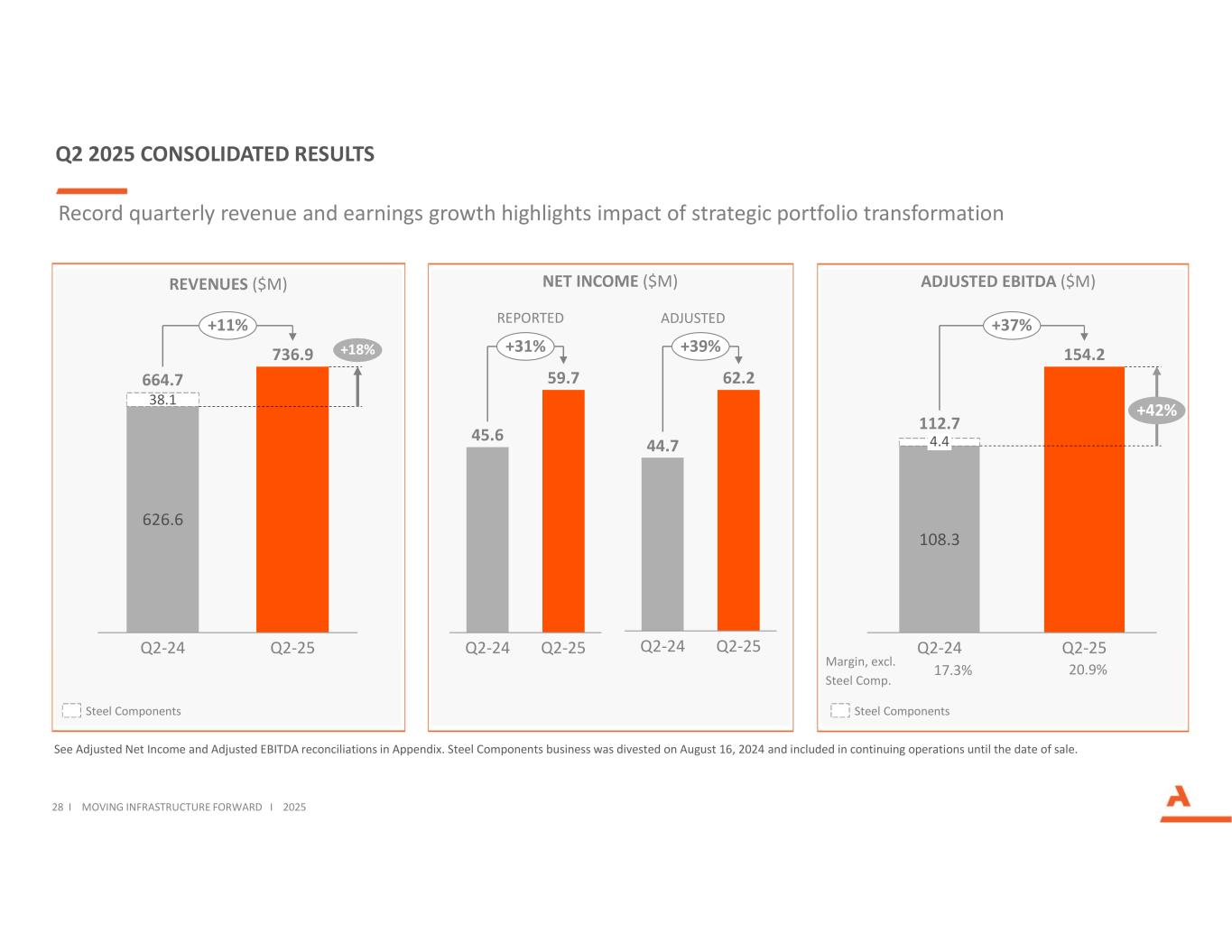 STRONG TRACK RECORD OF GROWTH AND MARGIN EXPANSION WHILE TRANSFORMING PORTFOLIO (1)Margin excludes the gain on land sale in 2023. See Adjusted EBITDA and Adjusted Segment EBITDA reconciliations in Appendix. 27 I MOVING INFRASTRUCTURE FORWARD I 2025 73 92 138 180 199 223 282 309 82 129 116 125 149 159 196 64 64 78 27 116 64 58 -32 -44 -48 -46 -50 62 -58 -57-55 FY 2018 2019 2020 2021 2022 22 2023 2024 LTM 2Q 2025 187 241 284 283 325 368 447 506 24 15% ADJUSTED EBITDA ($M) Transportation Products Engineered Structures Gain on land sale Construction Products Corporate Margin 12.8% 17.4%13.9% 14.7% 13.9% 14.5% 15.1%(1) 18.9%
