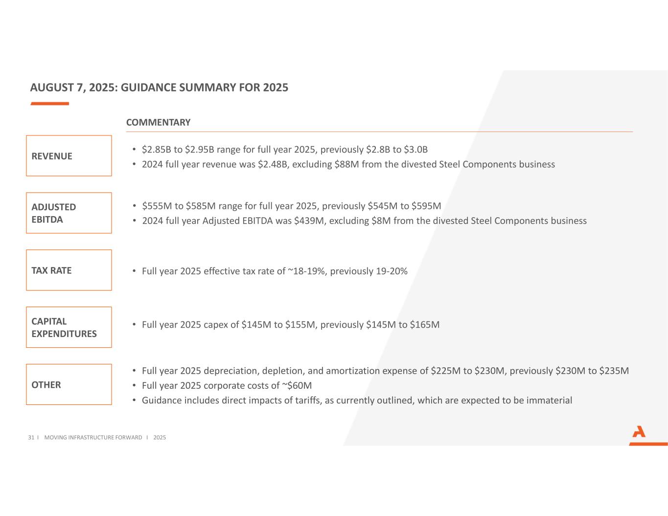 AUGUST 7, 2025: GUIDANCE SUMMARY FOR 2025 ADJUSTED EBITDA COMMENTARY CAPITAL EXPENDITURES OTHER • $555M to $585M range for full year 2025, previously $545M to $595M • 2024 full year Adjusted EBITDA was $439M, excluding $8M from the divested Steel Components business • Full year 2025 capex of $145M to $155M, previously $145M to $165M TAX RATE • Full year 2025 depreciation, depletion, and amortization expense of $225M to $230M, previously $230M to $235M • Full year 2025 corporate costs of ~$60M • Guidance includes direct impacts of tariffs, as currently outlined, which are expected to be immaterial • Full year 2025 effective tax rate of ~18-19%, previously 19-20% REVENUE • $2.85B to $2.95B range for full year 2025, previously $2.8B to $3.0B • 2024 full year revenue was $2.48B, excluding $88M from the divested Steel Components business 31 I MOVING INFRASTRUCTURE FORWARD I 2025