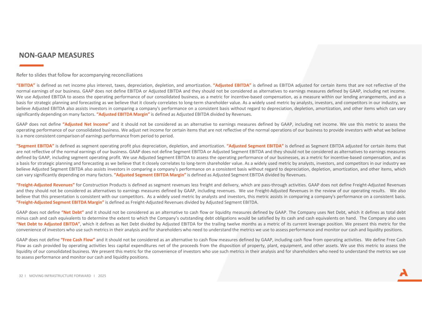 NON-GAAP MEASURES Refer to slides that follow for accompanying reconciliations “EBITDA” is defined as net income plus interest, taxes, depreciation, depletion, and amortization. “Adjusted EBITDA” is defined as EBITDA adjusted for certain items that are not reflective of the normal earnings of our business. GAAP does not define EBITDA or Adjusted EBITDA and they should not be considered as alternatives to earnings measures defined by GAAP, including net income. We use Adjusted EBITDA to assess the operating performance of our consolidated business, as a metric for incentive-based compensation, as a measure within our lending arrangements, and as a basis for strategic planning and forecasting as we believe that it closely correlates to long-term shareholder value. As a widely used metric by analysts, investors, and competitors in our industry, we believe Adjusted EBITDA also assists investors in comparing a company's performance on a consistent basis without regard to depreciation, depletion, amortization, and other items which can vary significantly depending on many factors. “Adjusted EBITDA Margin” is defined as Adjusted EBITDA divided by Revenues. GAAP does not define “Adjusted Net Income” and it should not be considered as an alternative to earnings measures defined by GAAP, including net income. We use this metric to assess the operating performance of our consolidated business. We adjust net income for certain items that are not reflective of the normal operations of our business to provide investors with what we believe is a more consistent comparison of earnings performance from period to period. “Segment EBITDA” is defined as segment operating profit plus depreciation, depletion, and amortization. “Adjusted Segment EBITDA” is defined as Segment EBITDA adjusted for certain items that are not reflective of the normal earnings of our business. GAAP does not define Segment EBITDA or Adjusted Segment EBITDA and they should not be considered as alternatives to earnings measures defined by GAAP, including segment operating profit. We use Adjusted Segment EBITDA to assess the operating performance of our businesses, as a metric for incentive-based compensation, and as a basis for strategic planning and forecasting as we believe that it closely correlates to long-term shareholder value. As a widely used metric by analysts, investors, and competitors in our industry we believe Adjusted Segment EBITDA also assists investors in comparing a company's performance on a consistent basis without regard to depreciation, depletion, amortization, and other items, which can vary significantly depending on many factors. “Adjusted Segment EBITDA Margin” is defined as Adjusted Segment EBITDA divided by Revenues. “Freight-Adjusted Revenues” for Construction Products is defined as segment revenues less freight and delivery, which are pass-through activities. GAAP does not define Freight-Adjusted Revenues and they should not be considered as alternatives to earnings measures defined by GAAP, including revenues. We use Freight-Adjusted Revenues in the review of our operating results. We also believe that this presentation is consistent with our competitors. As a widely used metric by analysts and investors, this metric assists in comparing a company's performance on a consistent basis. “Freight-Adjusted Segment EBITDA Margin” is defined as Freight-Adjusted Revenues divided by Adjusted Segment EBITDA. GAAP does not define “Net Debt” and it should not be considered as an alternative to cash flow or liquidity measures defined by GAAP. The Company uses Net Debt, which it defines as total debt minus cash and cash equivalents to determine the extent to which the Company’s outstanding debt obligations would be satisfied by its cash and cash equivalents on hand. The Company also uses “Net Debt to Adjusted EBITDA”, which it defines as Net Debt divided by Adjusted EBITDA for the trailing twelve months as a metric of its current leverage position. We present this metric for the convenience of investors who use such metrics in their analysis and for shareholders who need to understand the metrics we use to assess performance and monitor our cash and liquidity positions. GAAP does not define “Free Cash Flow” and it should not be considered as an alternative to cash flow measures defined by GAAP, including cash flow from operating activities. We define Free Cash Flow as cash provided by operating activities less capital expenditures net of the proceeds from the disposition of property, plant, equipment, and other assets. We use this metric to assess the liquidity of our consolidated business. We present this metric for the convenience of investors who use such metrics in their analysis and for shareholders who need to understand the metrics we use to assess performance and monitor our cash and liquidity positions. 32 I MOVING INFRASTRUCTURE FORWARD I 2025