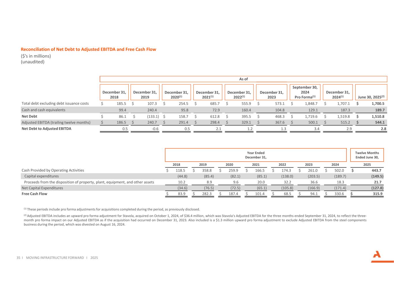 35 Moving Infrastructure ForwardI MOVING INFRASTRUCTURE FORWARD I 2025 Reconciliation of Net Debt to Adjusted EBITDA and Free Cash Flow ($’s in millions) (unaudited) (1) These periods include pro forma adjustments for acquisitions completed during the period, as previously disclosed. (2) Adjusted EBITDA includes an upward pro forma adjustment for Stavola, acquired on October 1, 2024, of $36.4 million, which was Stavola's Adjusted EBITDA for the three months ended September 31, 2024, to reflect the three- month pro forma impact on our Adjusted EBITDA as if the acquisition had occurred on December 31, 2023. Also included is a $1.3 million upward pro forma adjustment to exclude Adjusted EBITDA from the steel components business during the period, which was divested on August 16, 2024. As of June 30, 2025(2) December 31, 2024(1) September 30, 2024 Pro Forma(1) December 31, 2023 December 31, 2022(1) December 31, 2021(1) December 31, 2020(1) December 31, 2019 December 31, 2018 $ 1,700.5$ 1,707.1$ 1,848.7$ 573.1$ 555.9$ 685.7$ 254.5$ 107.3$ 185.5Total debt excluding debt issuance costs 189.7187.3129.1104.8160.472.995.8240.499.4Cash and cash equivalents $ 1,510.8$ 1,519.8$ 1,719.6$ 468.3$ 395.5$ 612.8$ 158.7$ (133.1)$ 86.1Net Debt $ 544.1$ 515.2$ 500.1$ 367.6$ 329.1$ 298.4$ 291.4$ 240.7$ 186.5Adjusted EBITDA (trailing twelve months) 2.82.93.41.31.22.10.5-0.60.5Net Debt to Adjusted EBITDA Twelve Months Ended June 30, Year Ended December 31, 20252024202320222021202020192018 $ 443.7$ 502.0$ 261.0$ 174.3$ 166.5$ 259.9$ 358.8$ 118.5Cash Provided by Operating Activities (149.5)(189.7)(203.5)(138.0)(85.1)(82.1)(85.4)(44.8)Capital expenditures 21.718.336.632.220.09.68.910.2Proceeds from the disposition of property, plant, equipment, and other assets (127.8)(171.4)(166.9)(105.8)(65.1)(72.5)(76.5)(34.6)Net Capital Expenditures $ 315.9$ 330.6$ 94.1$ 68.5$ 101.4$ 187.4$ 282.3$ 83.9Free Cash Flow