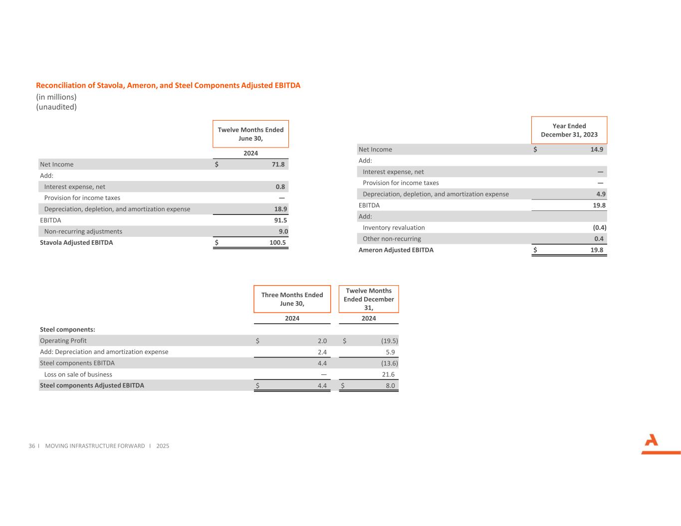 36 Moving Infrastructure ForwardI MOVING INFRASTRUCTURE FORWARD I 2025 Reconciliation of Stavola, Ameron, and Steel Components Adjusted EBITDA (in millions) (unaudited) Twelve Months Ended June 30, 2024 $ 71.8Net Income Add: 0.8Interest expense, net —Provision for income taxes 18.9Depreciation, depletion, and amortization expense 91.5EBITDA 9.0 Non-recurring adjustments $ 100.5Stavola Adjusted EBITDA Year Ended December 31, 2023 $ 14.9Net Income Add: —Interest expense, net —Provision for income taxes 4.9Depreciation, depletion, and amortization expense 19.8EBITDA Add: (0.4)Inventory revaluation 0.4Other non-recurring $ 19.8Ameron Adjusted EBITDA Twelve Months Ended December 31, Three Months Ended June 30, 20242024 Steel components: $ (19.5)$ 2.0Operating Profit 5.92.4Add: Depreciation and amortization expense (13.6)4.4Steel components EBITDA 21.6—Loss on sale of business $ 8.0$ 4.4Steel components Adjusted EBITDA