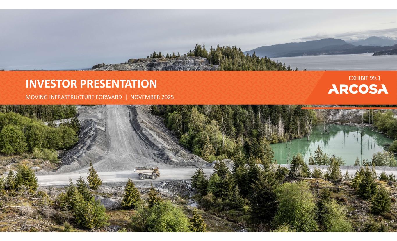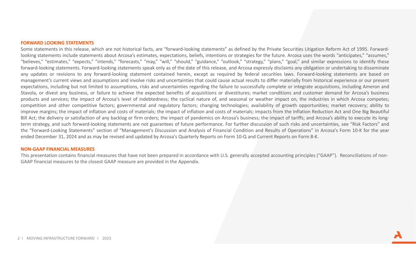 2 I MOVING INFRASTRUCTURE FORWARD I 2025 FORWARD LOOKING STATEMENTS Some statements in this release, which are not historical facts, are “forward-looking statements” as defined by the Private Securities Litigation Reform Act of 1995. Forward- looking statements include statements about Arcosa’s estimates, expectations, beliefs, intentions or strategies for the future. Arcosa uses the words “anticipates,” “assumes,” “believes,” “estimates,” “expects,” “intends,” “forecasts,” “may,” “will,” “should,” “guidance,” “outlook,” “strategy,” “plans,” “goal,” and similar expressions to identify these forward-looking statements. Forward-looking statements speak only as of the date of this release, and Arcosa expressly disclaims any obligation or undertaking to disseminate any updates or revisions to any forward-looking statement contained herein, except as required by federal securities laws. Forward-looking statements are based on management’s current views and assumptions and involve risks and uncertainties that could cause actual results to differ materially from historical experience or our present expectations, including but not limited to assumptions, risks and uncertainties regarding the failure to successfully complete or integrate acquisitions, including Ameron and Stavola, or divest any business, or failure to achieve the expected benefits of acquisitions or divestitures; market conditions and customer demand for Arcosa’s business products and services; the impact of Arcosa's level of indebtedness; the cyclical nature of, and seasonal or weather impact on, the industries in which Arcosa competes; competition and other competitive factors; governmental and regulatory factors; changing technologies; availability of growth opportunities; market recovery; ability to improve margins; the impact of inflation and costs of materials; the impact of inflation and costs of materials; impacts from the Inflation Reduction Act and One Big Beautiful Bill Act; the delivery or satisfaction of any backlog or firm orders; the impact of pandemics on Arcosa’s business; the impact of tariffs; and Arcosa’s ability to execute its long- term strategy, and such forward-looking statements are not guarantees of future performance. For further discussion of such risks and uncertainties, see “Risk Factors” and the “Forward-Looking Statements” section of “Management's Discussion and Analysis of Financial Condition and Results of Operations” in Arcosa's Form 10-K for the year ended December 31, 2024 and as may be revised and updated by Arcosa's Quarterly Reports on Form 10-Q and Current Reports on Form 8-K. NON-GAAP FINANCIAL MEASURES This presentation contains financial measures that have not been prepared in accordance with U.S. generally accepted accounting principles (“GAAP”). Reconciliations of non- GAAP financial measures to the closest GAAP measure are provided in the Appendix.