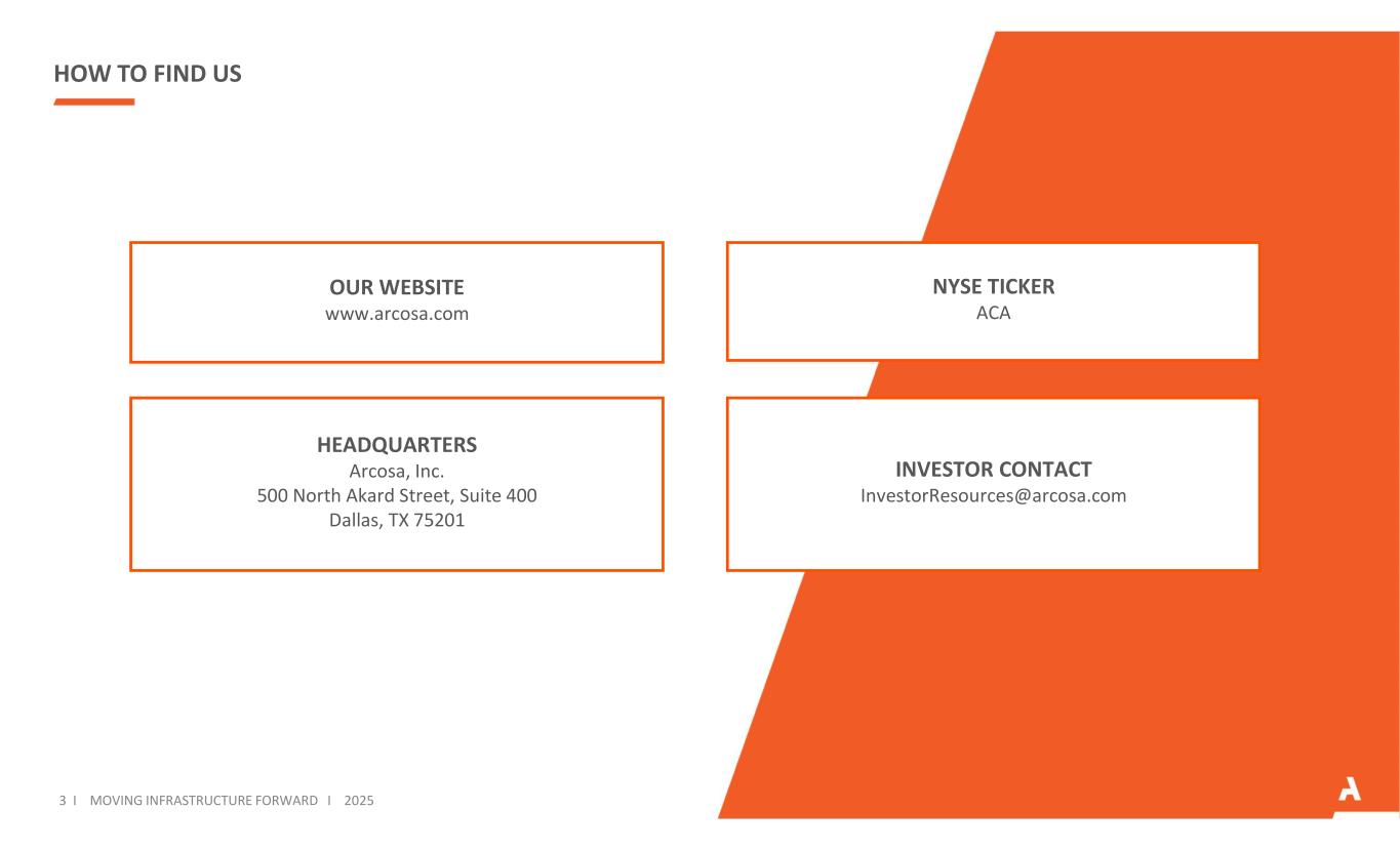 HOW TO FIND US OUR WEBSITE www.arcosa.com NYSE TICKER ACA HEADQUARTERS Arcosa, Inc. 500 North Akard Street, Suite 400 Dallas, TX 75201 INVESTOR CONTACT InvestorResources@arcosa.com 3 I MOVING INFRASTRUCTURE FORWARD I 2025