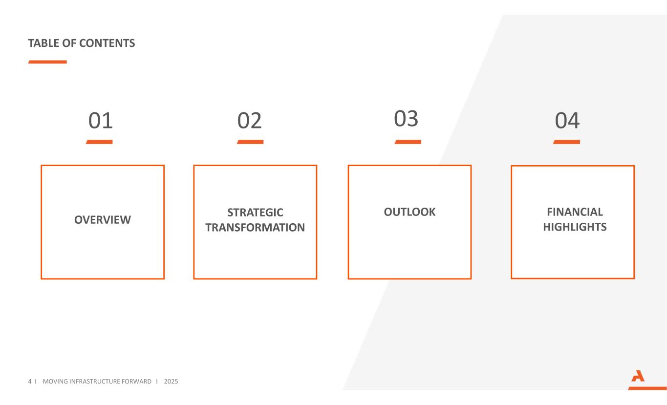 01 03 04 OVERVIEW FINANCIAL HIGHLIGHTS 02 OUTLOOK TABLE OF CONTENTS 4 I MOVING INFRASTRUCTURE FORWARD I 2025 STRATEGIC TRANSFORMATION