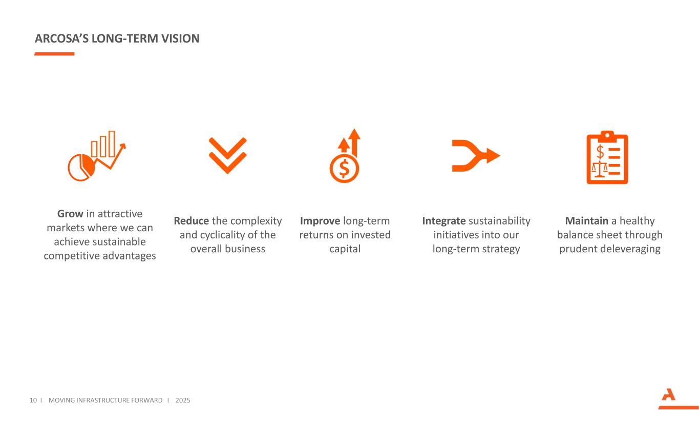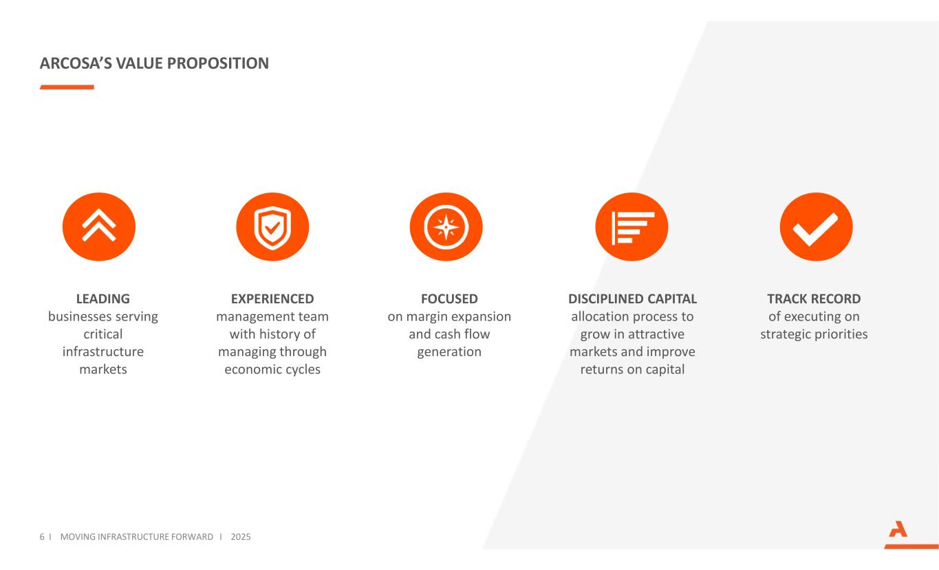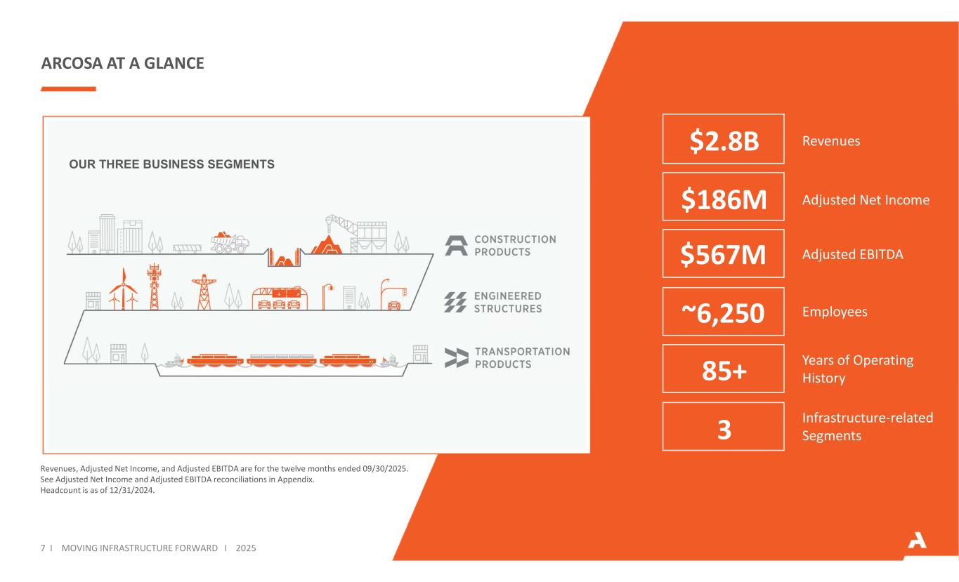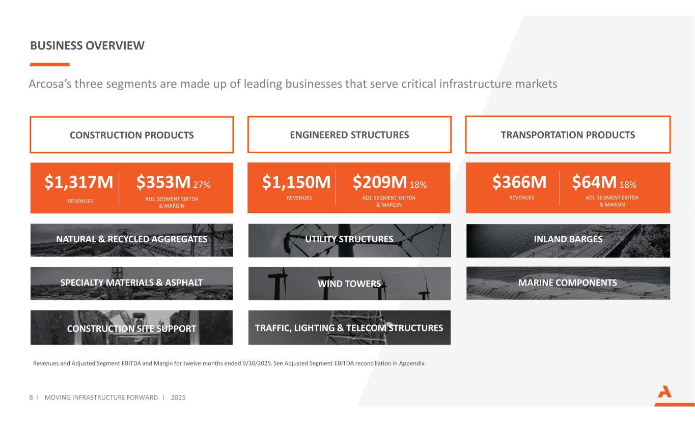 ARCOSA AT A GLANCE Revenues, Adjusted Net Income, and Adjusted EBITDA are for the twelve months ended 09/30/2025. See Adjusted Net Income and Adjusted EBITDA reconciliations in Appendix. Headcount is as of 12/31/2024. Adjusted Net Income Adjusted EBITDA Infrastructure-related Segments Employees Years of Operating History OUR THREE BUSINESS SEGMENTS Revenues$2.8B $186M $567M ~6,250 85+ 3 7 I MOVING INFRASTRUCTURE FORWARD I 2025