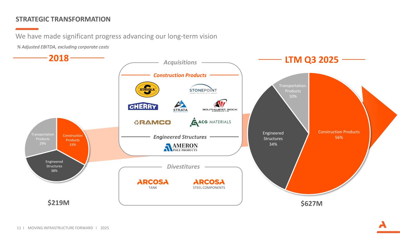 10 I MOVING INFRASTRUCTURE FORWARD I 2025 ARCOSA’S LONG-TERM VISION Reduce the complexity and cyclicality of the overall business Integrate sustainability initiatives into our long-term strategy Improve long-term returns on invested capital Grow in attractive markets where we can achieve sustainable competitive advantages Maintain a healthy balance sheet through prudent deleveraging