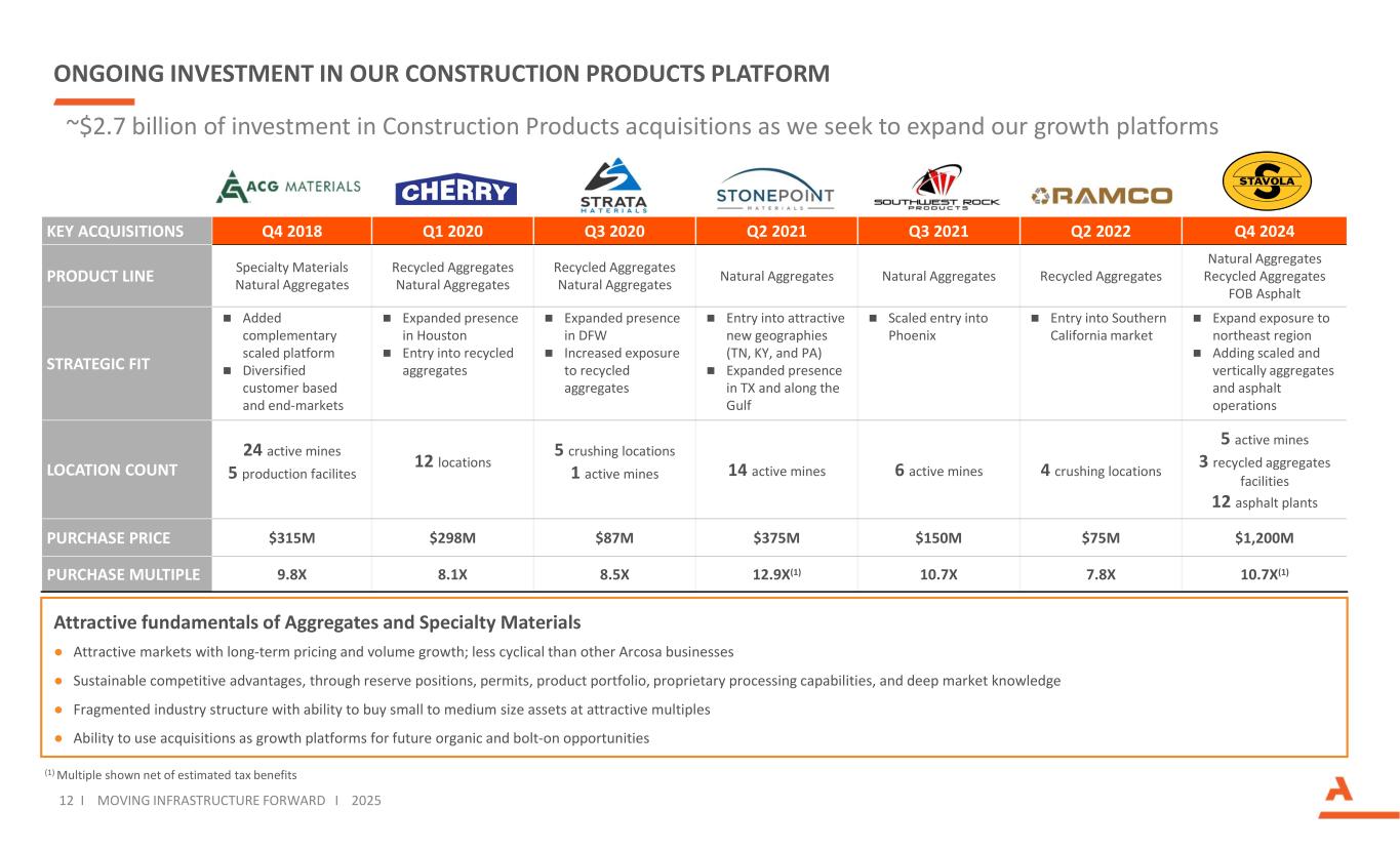 Construction Products 33% Engineered Structures 38% Transportation Products 29% We have made significant progress advancing our long-term vision 11 I MOVING INFRASTRUCTURE FORWARD I 2025 % Adjusted EBITDA, excluding corporate costs LTM Q3 20252018 Construction Products 56% Engineered Structures 34% Transportation. Products 10% Acquisitions Construction Products Engineered Structures Divestitures STEEL COMPONENTSTANK $219M $627M STRATEGIC TRANSFORMATION