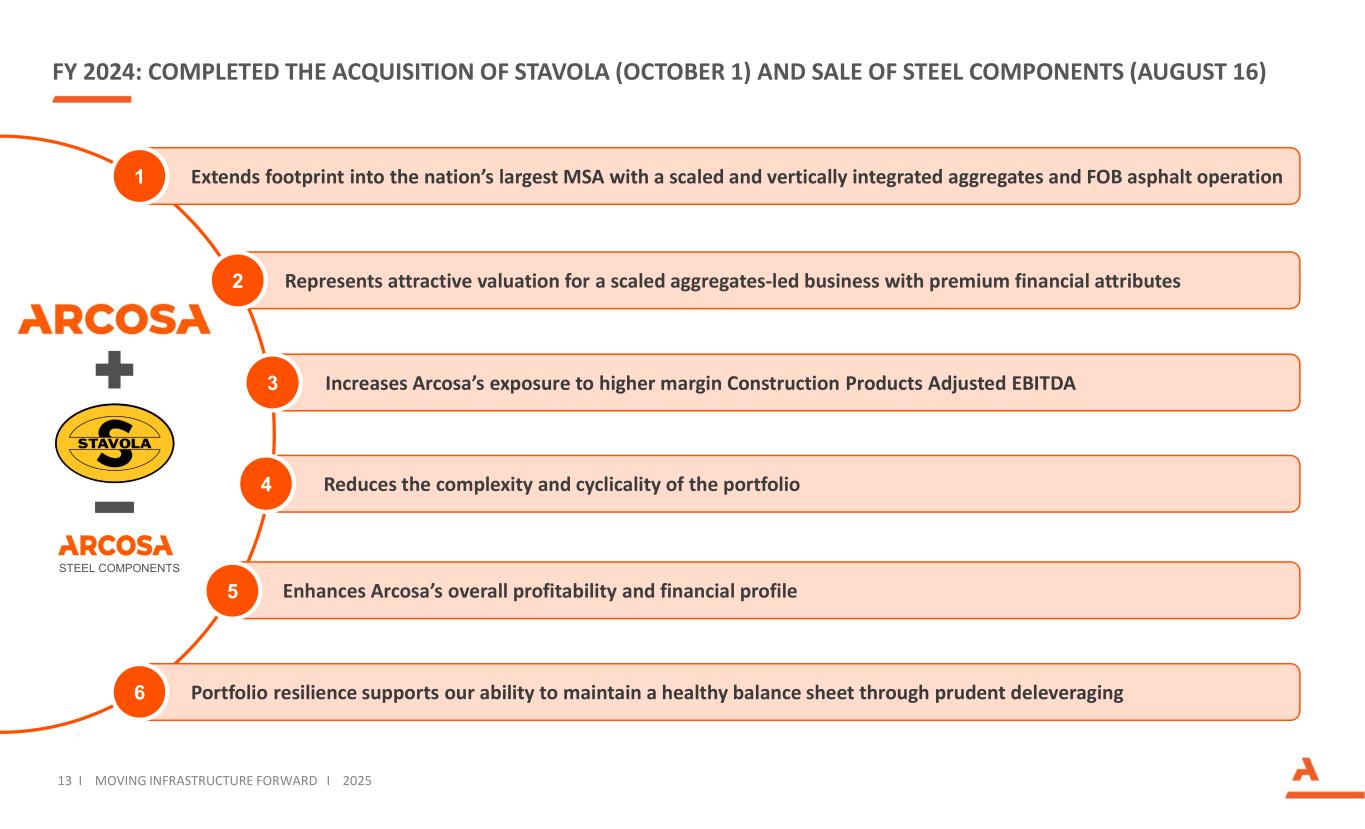~$2.7 billion of investment in Construction Products acquisitions as we seek to expand our growth platforms 12 I MOVING INFRASTRUCTURE FORWARD I 2025 ONGOING INVESTMENT IN OUR CONSTRUCTION PRODUCTS PLATFORM Q4 2024Q2 2022Q3 2021Q2 2021Q3 2020Q1 2020Q4 2018KEY ACQUISITIONS Natural Aggregates Recycled Aggregates FOB Asphalt Recycled AggregatesNatural AggregatesNatural AggregatesRecycled Aggregates Natural Aggregates Recycled Aggregates Natural Aggregates Specialty Materials Natural AggregatesPRODUCT LINE Expand exposure to northeast region Adding scaled and vertically aggregates and asphalt operations Entry into Southern California market Scaled entry into Phoenix Entry into attractive new geographies (TN, KY, and PA) Expanded presence in TX and along the Gulf Expanded presence in DFW Increased exposure to recycled aggregates Expanded presence in Houston Entry into recycled aggregates Added complementary scaled platform Diversified customer based and end-markets STRATEGIC FIT 5 active mines 3 recycled aggregates facilities 12 asphalt plants 4 crushing locations6 active mines14 active mines 5 crushing locations 1 active mines 12 locations 24 active mines 5 production facilitesLOCATION COUNT $1,200M$75M$150M$375M$87M$298M$315MPURCHASE PRICE 10.7X(1)7.8X10.7X12.9X(1)8.5X8.1X9.8XPURCHASE MULTIPLE Attractive fundamentals of Aggregates and Specialty Materials ● Attractive markets with long-term pricing and volume growth; less cyclical than other Arcosa businesses ● Sustainable competitive advantages, through reserve positions, permits, product portfolio, proprietary processing capabilities, and deep market knowledge ● Fragmented industry structure with ability to buy small to medium size assets at attractive multiples ● Ability to use acquisitions as growth platforms for future organic and bolt-on opportunities (1) Multiple shown net of estimated tax benefits