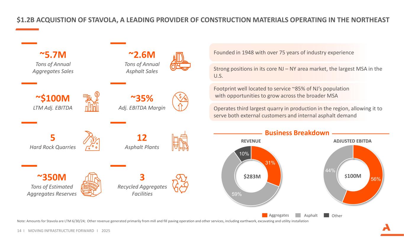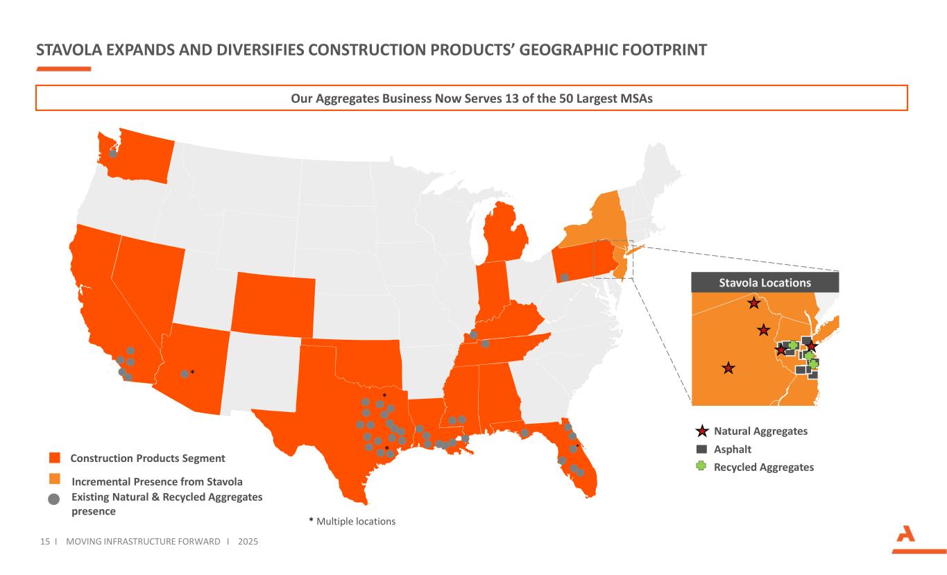 $1.2B ACQUISTION OF STAVOLA, A LEADING PROVIDER OF CONSTRUCTION MATERIALS OPERATING IN THE NORTHEAST BY THE NUMBERS COMPANY HIGHLIGHTS Operates third largest quarry in production in the region, allowing it to serve both external customers and internal asphalt demand Founded in 1948 with over 75 years of industry experience Footprint well located to service ~85% of NJ’s population with opportunities to grow across the broader MSA Strong positions in its core NJ – NY area market, the largest MSA in the U.S. Aggregates Asphalt Other ADJUSTED EBITDA 14 I MOVING INFRASTRUCTURE FORWARD I 2025 Business Breakdown 31% 59% 10% $283M ~$100M LTM Adj. EBITDA ~35% Adj. EBITDA Margin ~5.7M Tons of Annual Aggregates Sales ~2.6M Tons of Annual Asphalt Sales 5 Hard Rock Quarries 12 Asphalt Plants 3 Recycled Aggregates Facilities ~350M Tons of Estimated Aggregates Reserves Note: Amounts for Stavola are LTM 6/30/24; Other revenue generated primarily from mill and fill paving operation and other services, including earthwork, excavating and utility installation 56% 44% $100M REVENUE