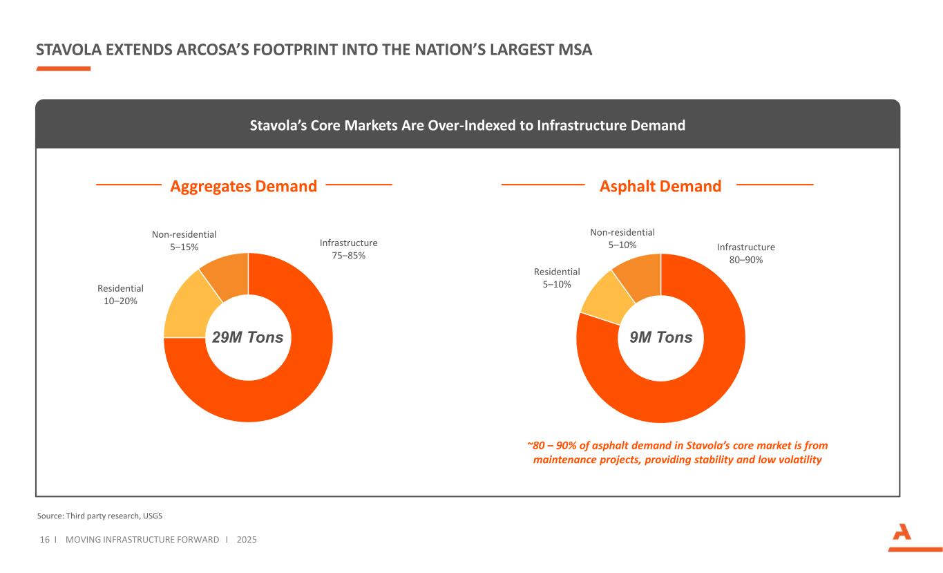 15 I MOVING INFRASTRUCTURE FORWARD I 2025 STAVOLA EXPANDS AND DIVERSIFIES CONSTRUCTION PRODUCTS’ GEOGRAPHIC FOOTPRINT Our Aggregates Business Now Serves 13 of the 50 Largest MSAs Natural Aggregates Recycled Aggregates Asphalt Stavola Locations Incremental Presence from Stavola Construction Products Segment Existing Natural & Recycled Aggregates presence * * * * * Multiple locations