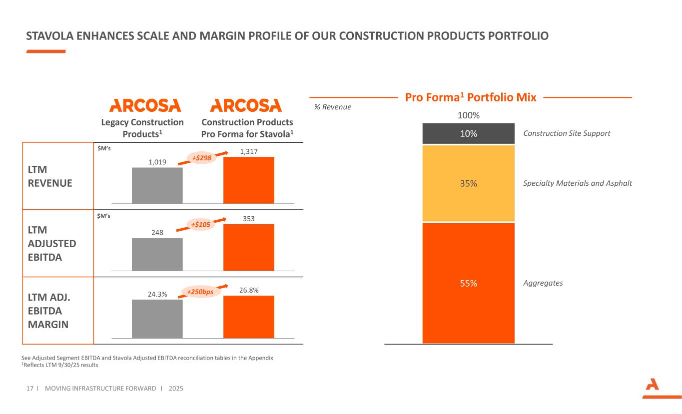STAVOLA EXTENDS ARCOSA’S FOOTPRINT INTO THE NATION’S LARGEST MSA 16 I MOVING INFRASTRUCTURE FORWARD I 2025 Infrastructure 75–85% Residential 10–20% Non-residential 5–15% Aggregates Demand Asphalt Demand Infrastructure 80–90% Residential 5–10% Non-residential 5–10% Stavola’s Core Markets Are Over-Indexed to Infrastructure Demand 29M Tons ~80 – 90% of asphalt demand in Stavola’s core market is from maintenance projects, providing stability and low volatility 9M Tons Source: Third party research, USGS