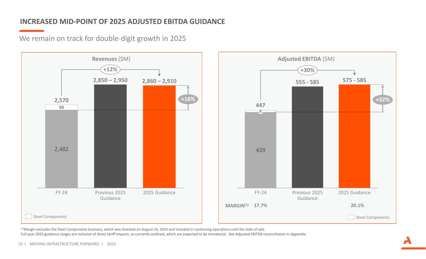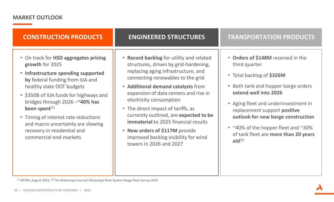 We remain on track for double-digit growth in 2025 (1)Margin excludes the Steel Components business, which was divested on August 16, 2024 and included in continuing operations until the date of sale. Full year 2025 guidance ranges are inclusive of direct tariff impacts, as currently outlined, which are expected to be immaterial. See Adjusted EBITDA reconciliation in Appendix INCREASED MID-POINT OF 2025 ADJUSTED EBITDA GUIDANCE 439 8 FY-24 Previous 2025 Guidance 2025 Guidance 447 555 - 585 575 - 585 +32% +30% Adjusted EBITDA ($M) 19 I MOVING INFRASTRUCTURE FORWARD I 2025 MARGIN(1) 17.7% 2,482 88 FY-24 Previous 2025 Guidance 2025 Guidance 2,570 2,850 – 2,950 2,860 – 2,910 +16% +12% Revenues ($M) Steel Components 20.1% Steel Components