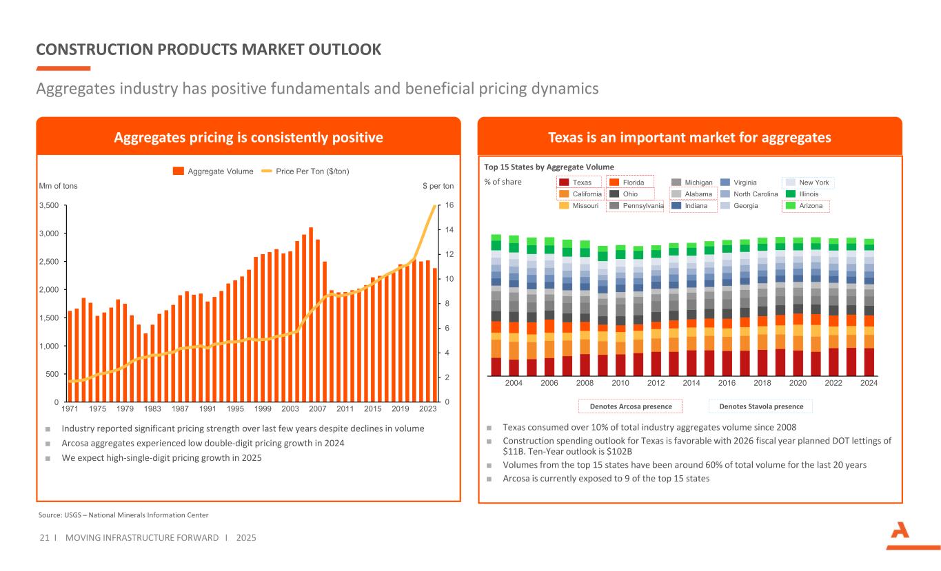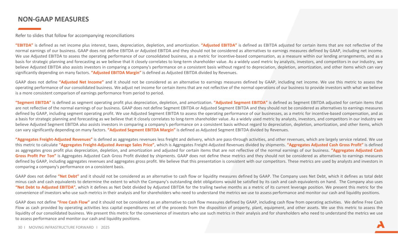 NON-GAAP MEASURES Refer to slides that follow for accompanying reconciliations “EBITDA” is defined as net income plus interest, taxes, depreciation, depletion, and amortization. “Adjusted EBITDA” is defined as EBITDA adjusted for certain items that are not reflective of the normal earnings of our business. GAAP does not define EBITDA or Adjusted EBITDA and they should not be considered as alternatives to earnings measures defined by GAAP, including net income. We use Adjusted EBITDA to assess the operating performance of our consolidated business, as a metric for incentive-based compensation, as a measure within our lending arrangements, and as a basis for strategic planning and forecasting as we believe that it closely correlates to long-term shareholder value. As a widely used metric by analysts, investors, and competitors in our industry, we believe Adjusted EBITDA also assists investors in comparing a company's performance on a consistent basis without regard to depreciation, depletion, amortization, and other items which can vary significantly depending on many factors. “Adjusted EBITDA Margin” is defined as Adjusted EBITDA divided by Revenues. GAAP does not define “Adjusted Net Income” and it should not be considered as an alternative to earnings measures defined by GAAP, including net income. We use this metric to assess the operating performance of our consolidated business. We adjust net income for certain items that are not reflective of the normal operations of our business to provide investors with what we believe is a more consistent comparison of earnings performance from period to period. “Segment EBITDA” is defined as segment operating profit plus depreciation, depletion, and amortization. “Adjusted Segment EBITDA” is defined as Segment EBITDA adjusted for certain items that are not reflective of the normal earnings of our business. GAAP does not define Segment EBITDA or Adjusted Segment EBITDA and they should not be considered as alternatives to earnings measures defined by GAAP, including segment operating profit. We use Adjusted Segment EBITDA to assess the operating performance of our businesses, as a metric for incentive-based compensation, and as a basis for strategic planning and forecasting as we believe that it closely correlates to long-term shareholder value. As a widely used metric by analysts, investors, and competitors in our industry we believe Adjusted Segment EBITDA also assists investors in comparing a company's performance on a consistent basis without regard to depreciation, depletion, amortization, and other items, which can vary significantly depending on many factors. “Adjusted Segment EBITDA Margin” is defined as Adjusted Segment EBITDA divided by Revenues. “Aggregates Freight-Adjusted Revenues” is defined as aggregates revenues less freight and delivery, which are pass-through activities, and other revenues, which are largely service related. We use this metric to calculate “Aggregates Freight-Adjusted Average Sales Price”, which is Aggregates Freight-Adjusted Revenues divided by shipments. “Aggregates Adjusted Cash Gross Profit” is defined as aggregates gross profit plus depreciation, depletion, and amortization and adjusted for certain items that are not reflective of the normal earnings of our business. “Aggregates Adjusted Cash Gross Profit Per Ton” is Aggregates Adjusted Cash Gross Profit divided by shipments. GAAP does not define these metrics and they should not be considered as alternatives to earnings measures defined by GAAP, including aggregates revenues and aggregates gross profit. We believe that this presentation is consistent with our competitors. These metrics are used by analysts and investors in comparing a company's performance on a consistent basis. GAAP does not define “Net Debt” and it should not be considered as an alternative to cash flow or liquidity measures defined by GAAP. The Company uses Net Debt, which it defines as total debt minus cash and cash equivalents to determine the extent to which the Company’s outstanding debt obligations would be satisfied by its cash and cash equivalents on hand. The Company also uses “Net Debt to Adjusted EBITDA”, which it defines as Net Debt divided by Adjusted EBITDA for the trailing twelve months as a metric of its current leverage position. We present this metric for the convenience of investors who use such metrics in their analysis and for shareholders who need to understand the metrics we use to assess performance and monitor our cash and liquidity positions. GAAP does not define “Free Cash Flow” and it should not be considered as an alternative to cash flow measures defined by GAAP, including cash flow from operating activities. We define Free Cash Flow as cash provided by operating activities less capital expenditures net of the proceeds from the disposition of property, plant, equipment, and other assets. We use this metric to assess the liquidity of our consolidated business. We present this metric for the convenience of investors who use such metrics in their analysis and for shareholders who need to understand the metrics we use to assess performance and monitor our cash and liquidity positions. 30 I MOVING INFRASTRUCTURE FORWARD I 2025