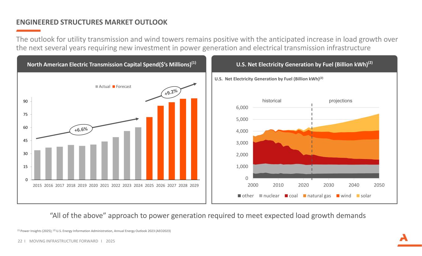 CONSTRUCTION PRODUCTS MARKET OUTLOOK 21 I MOVING INFRASTRUCTURE FORWARD I 2025 Source: USGS – National Minerals Information Center Aggregates industry has positive fundamentals and beneficial pricing dynamics Texas is an important market for aggregatesAggregates pricing is consistently positive ■ Industry reported significant pricing strength over last few years despite declines in volume ■ Arcosa aggregates experienced low double-digit pricing growth in 2024 ■ We expect high-single-digit pricing growth in 2025 Top 15 States by Aggregate Volume ■ Texas consumed over 10% of total industry aggregates volume since 2008 ■ Construction spending outlook for Texas is favorable with 2026 fiscal year planned DOT lettings of $11B. Ten-Year outlook is $102B ■ Volumes from the top 15 states have been around 60% of total volume for the last 20 years ■ Arcosa is currently exposed to 9 of the top 15 states Denotes Arcosa presence Denotes Stavola presence % of share 0 2 4 6 8 10 12 14 16 0 500 1,000 1,500 2,000 2,500 3,000 3,500 Mm of tons $ per ton 1971 1975 1979 1983 1987 1991 1995 1999 2003 2007 2011 2015 2019 2023 Aggregate Volume Price Per Ton ($/ton) Texas California Missouri Florida Ohio Pennsylvania Michigan Alabama Indiana Virginia North Carolina Georgia New York Illinois Arizona 2004 2006 2008 2010 2012 2014 2016 2018 2020 2022 2024