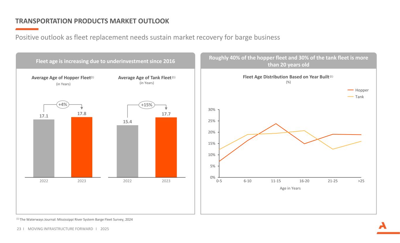 Total U.S. and Canada Electric Transmission: Reported CAPEX ($B) TRANSPORTATION PRODUCTS MARKET OUTLOOK 23 I MOVING INFRASTRUCTURE FORWARD I 2025 (1) The Waterways Journal: Mississippi River System Barge Fleet Survey, 2024 Positive outlook as fleet replacement needs sustain market recovery for barge business Roughly 40% of the hopper fleet and 30% of the tank fleet is more than 20 years old Total U.S. and Canada Electric Transmission: Reported CAPEX ($B) Fleet age is increasing due to underinvestment since 2016 17.1 17.8 2022 2023 +4% Average Age of Hopper Fleet(1) (in Years) 15.4 17.7 2022 2023 +15% Average Age of Tank Fleet (1) (in Years) 0% 5% 10% 15% 20% 25% 30% 0-5 6-10 11-15 16-20 21-25 >25 Hopper Tank Fleet Age Distribution Based on Year Built (1) (%) Age in Years