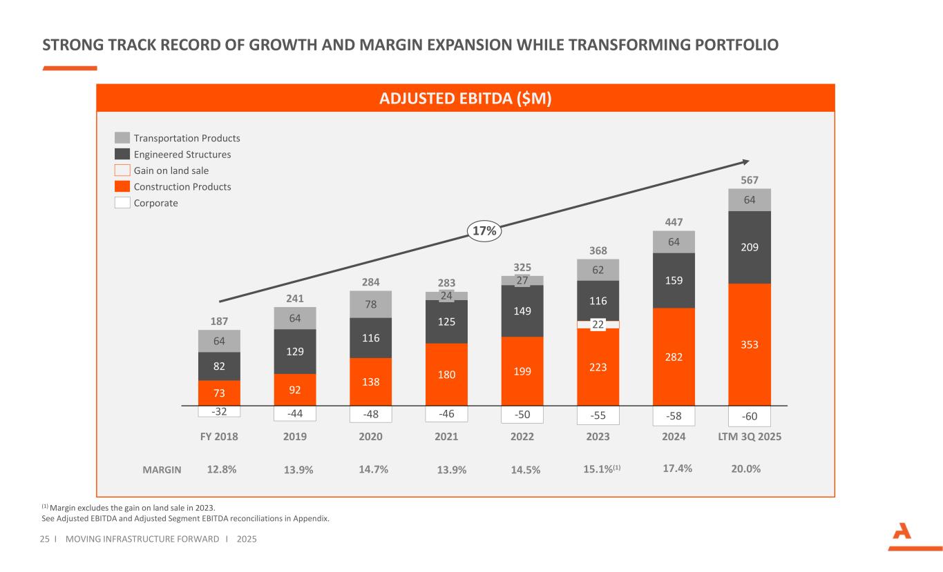 32 Moving Infrastructure ForwardI MOVING INFRASTRUCTURE FORWARD I 2025 Reconciliation of Adjusted Segment EBITDA (1) Includes the impact of the fair value markup of acquired long-lived assets. (2) Expenses associated with acquisitions and divestitures, including the cost impact of the fair value markup of acquired inventory, advisory and professional fees, integration, separation, and other transaction costs. ($’s in millions) (unaudited) Twelve Months Ended December 31,Twelve Months Ended September 30, 20182019202020212022202320242025 Construction Products $ 50.4$ 52.7$ 74.7$ 83.2$ 96.5$ 138.6$ 133.9$ 173.6Operating Profit 21.938.060.188.7102.7111.7134.7167.2Add: Depreciation, depletion, and amortization expense(1) 72.390.7134.8171.9199.2250.3268.6340.8Segment EBITDA 0.81.42.97.6——12.210.5Add: Impact of acquisition and divestiture-related expenses(2) ——0.8———5.82.0Add: Impairment charge ——————(5.0)—Less: Gain on sale of businesses —————(5.0)——Less: Benefit from reduction in holdback obligation $ 73.1$ 92.1$ 138.5$ 179.5$ 199.2$ 245.3$ 281.6$ 353.3Adjusted Segment EBITDA 25.0 %20.9 %23.3 %22.5 %21.6 %24.5 %25.5 %26.3 %Adjusted Segment EBITDA Margin Engineered Structures $ 28.6$ 100.7$ 80.2$ 88.0$ 307.0$ 95.7$ 126.4$ 159.1Operating Profit 29.727.931.533.130.526.645.450.1Add: Depreciation and amortization expense(1) 58.3128.6111.7121.1337.5122.3171.8209.2Segment EBITDA ——2.81.00.6—1.6—Add: Impact of acquisition and divestiture-related expenses(2) 23.2—1.32.9————Add: Impairment charge ————(189.0)(6.4)(14.5)—Less: Gain on sale of businesses $ 81.5$ 128.6$ 115.8$ 125.0$ 149.1$ 115.9$ 158.9$ 209.2Adjusted Segment EBITDA 10.4 %15.4 %13.2 %13.4 %14.9 %13.3 %15.2 %18.2 %Adjusted Segment EBITDA Margin Transportation Products $ 48.4$ 46.8$ 54.6$ 6.4$ 11.5$ 45.8$ 30.2$ 52.0Operating Profit 15.516.318.017.815.816.012.67.4Add: Depreciation and amortization expense(1) 63.963.172.624.227.361.842.859.4Segment EBITDA —0.6——————Add: Impact of acquisition and divestiture-related expenses(2) ——5.0—————Add: Impairment charge ——————21.64.7Add: Loss on sale of business $ 63.9$ 63.7$ 77.6$ 24.2$ 27.3$ 61.8$ 64.4$ 64.1Adjusted Segment EBITDA 16.3 %13.7 %16.6 %7.9 %8.6 %14.3 %15.4 %17.5 %Adjusted Segment EBITDA Margin $ (32.5)$ (47.3)$ (57.7)$ (70.3)$ (66.0)$ (62.8)$ (92.9)$ (78.6)Operating Loss - Corporate ——4.611.510.42.232.717.0Add: Impact of acquisition and divestiture-related expenses - Corporate(2) ———8.7————Add: Legal settlement 0.53.64.94.75.15.22.31.6Add: Corporate depreciation expense $ 186.5$ 240.7$ 283.7$ 283.3$ 325.1$ 367.6$ 447.0$ 566.6Adjusted EBITDA
