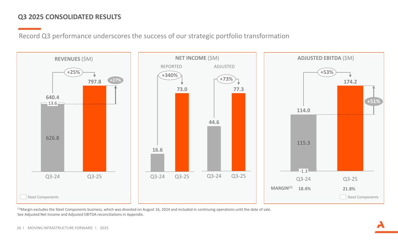 STRONG TRACK RECORD OF GROWTH AND MARGIN EXPANSION WHILE TRANSFORMING PORTFOLIO (1) Margin excludes the gain on land sale in 2023. See Adjusted EBITDA and Adjusted Segment EBITDA reconciliations in Appendix. 25 I MOVING INFRASTRUCTURE FORWARD I 2025 73 92 138 180 199 223 282 353 82 129 116 125 149 159 209 64 64 78 116 64 64 -32 -44 -48 -46 -50 62 -58 -60-55 FY 2018 2019 2020 24 2021 2022 22 2023 2024 LTM 3Q 2025 187 241 284 283 325 368 447 567 27 17% ADJUSTED EBITDA ($M) Transportation Products Engineered Structures Gain on land sale Construction Products Corporate MARGIN 12.8% 17.4%13.9% 14.7% 13.9% 14.5% 15.1%(1) 20.0%