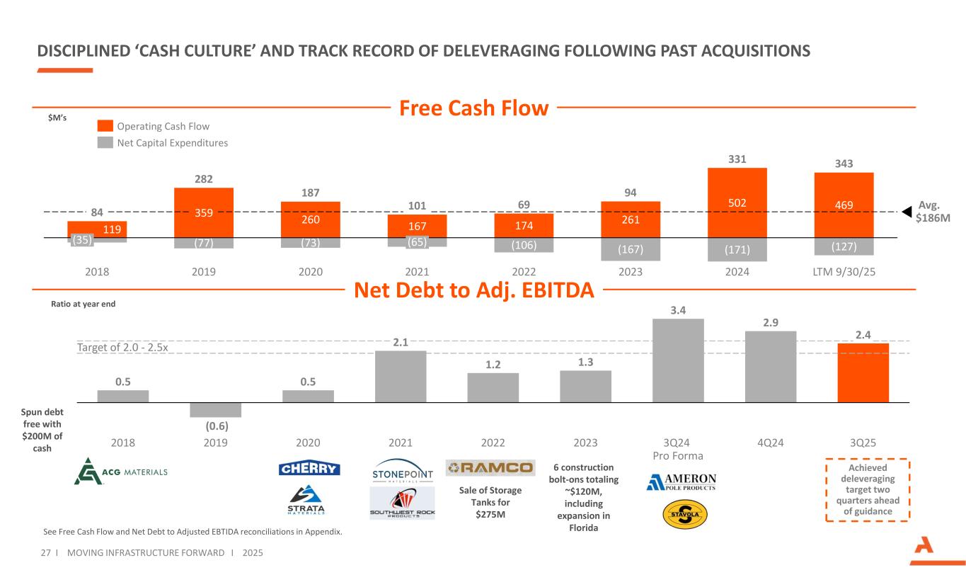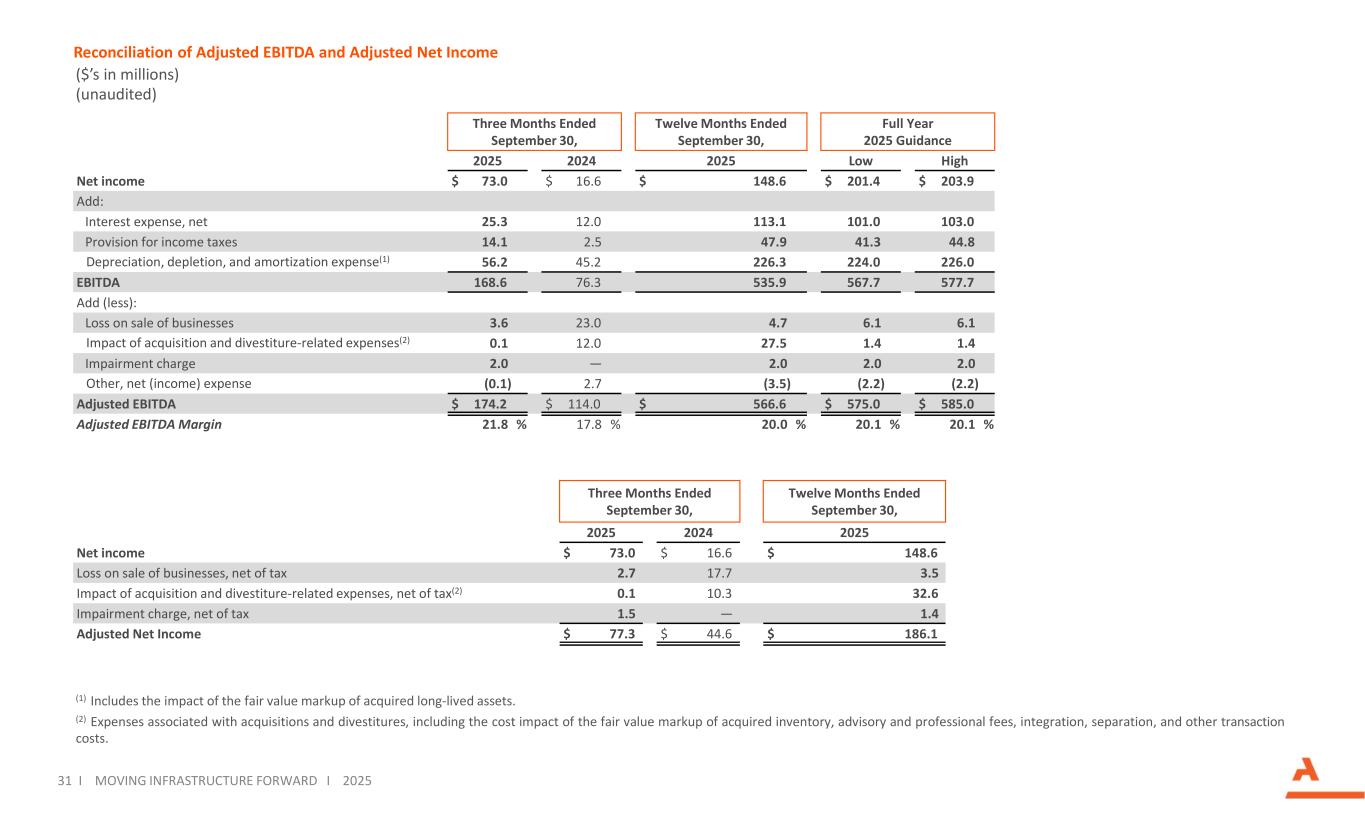 Reconciliation of Adjusted EBITDA and Adjusted Net Income 31 Moving Infrastructure Forward (1) Includes the impact of the fair value markup of acquired long-lived assets. (2) Expenses associated with acquisitions and divestitures, including the cost impact of the fair value markup of acquired inventory, advisory and professional fees, integration, separation, and other transaction costs. ($’s in millions) (unaudited) I MOVING INFRASTRUCTURE FORWARD I 2025 Full Year 2025 Guidance Twelve Months Ended September 30, Three Months Ended September 30, HighLow202520242025 $ 203.9$ 201.4$ 148.6$ 16.6$ 73.0Net income Add: 103.0101.0113.112.025.3Interest expense, net 44.841.347.92.514.1Provision for income taxes 226.0224.0226.345.256.2Depreciation, depletion, and amortization expense(1) 577.7567.7535.976.3168.6EBITDA Add (less): 6.16.14.723.03.6Loss on sale of businesses 1.41.427.512.00.1Impact of acquisition and divestiture-related expenses(2) 2.02.02.0—2.0Impairment charge (2.2)(2.2)(3.5)2.7(0.1)Other, net (income) expense $ 585.0$ 575.0$ 566.6$ 114.0$ 174.2Adjusted EBITDA 20.1 %20.1 %20.0 %17.8 %21.8 %Adjusted EBITDA Margin Twelve Months Ended September 30, Three Months Ended September 30, 202520242025 $ 148.6$ 16.6$ 73.0Net income 3.517.72.7Loss on sale of businesses, net of tax 32.610.30.1Impact of acquisition and divestiture-related expenses, net of tax(2) 1.4—1.5Impairment charge, net of tax $ 186.1$ 44.6$ 77.3Adjusted Net Income