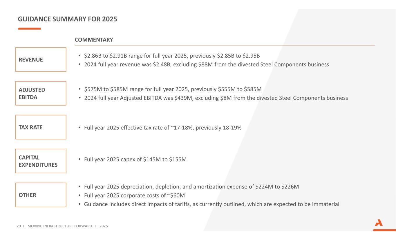 GUIDANCE SUMMARY FOR 2025 ADJUSTED EBITDA COMMENTARY CAPITAL EXPENDITURES OTHER • $575M to $585M range for full year 2025, previously $555M to $585M • 2024 full year Adjusted EBITDA was $439M, excluding $8M from the divested Steel Components business • Full year 2025 capex of $145M to $155M TAX RATE • Full year 2025 depreciation, depletion, and amortization expense of $224M to $226M • Full year 2025 corporate costs of ~$60M • Guidance includes direct impacts of tariffs, as currently outlined, which are expected to be immaterial • Full year 2025 effective tax rate of ~17-18%, previously 18-19% REVENUE • $2.86B to $2.91B range for full year 2025, previously $2.85B to $2.95B • 2024 full year revenue was $2.48B, excluding $88M from the divested Steel Components business 29 I MOVING INFRASTRUCTURE FORWARD I 2025