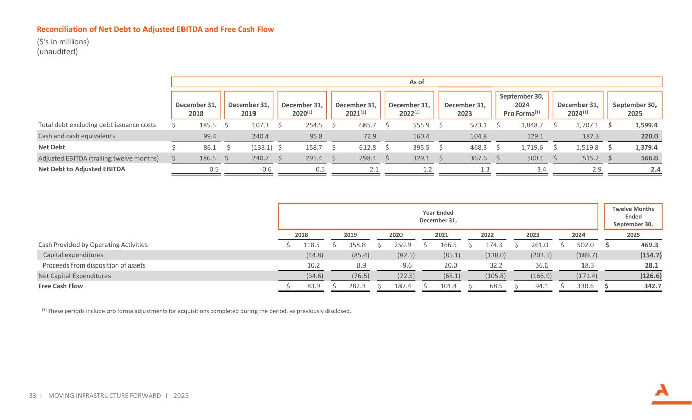 33 Moving Infrastructure ForwardI MOVING INFRASTRUCTURE FORWARD I 2025 Reconciliation of Net Debt to Adjusted EBITDA and Free Cash Flow ($’s in millions) (unaudited) (1) These periods include pro forma adjustments for acquisitions completed during the period, as previously disclosed. As of September 30, 2025 December 31, 2024(1) September 30, 2024 Pro Forma(1) December 31, 2023 December 31, 2022(1) December 31, 2021(1) December 31, 2020(1) December 31, 2019 December 31, 2018 $ 1,599.4$ 1,707.1$ 1,848.7$ 573.1$ 555.9$ 685.7$ 254.5$ 107.3$ 185.5Total debt excluding debt issuance costs 220.0187.3129.1104.8160.472.995.8240.499.4Cash and cash equivalents $ 1,379.4$ 1,519.8$ 1,719.6$ 468.3$ 395.5$ 612.8$ 158.7$ (133.1)$ 86.1Net Debt $ 566.6$ 515.2$ 500.1$ 367.6$ 329.1$ 298.4$ 291.4$ 240.7$ 186.5Adjusted EBITDA (trailing twelve months) 2.42.93.41.31.22.10.5-0.60.5Net Debt to Adjusted EBITDA Twelve Months Ended September 30, Year Ended December 31, 20252024202320222021202020192018 $ 469.3$ 502.0$ 261.0$ 174.3$ 166.5$ 259.9$ 358.8$ 118.5Cash Provided by Operating Activities (154.7)(189.7)(203.5)(138.0)(85.1)(82.1)(85.4)(44.8)Capital expenditures 28.118.336.632.220.09.68.910.2Proceeds from disposition of assets (126.6)(171.4)(166.9)(105.8)(65.1)(72.5)(76.5)(34.6)Net Capital Expenditures $ 342.7$ 330.6$ 94.1$ 68.5$ 101.4$ 187.4$ 282.3$ 83.9Free Cash Flow
