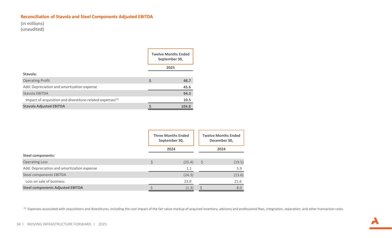 34 Moving Infrastructure ForwardI MOVING INFRASTRUCTURE FORWARD I 2025 Reconciliation of Stavola and Steel Components Adjusted EBITDA (in millions) (unaudited) Twelve Months Ended December 30, Three Months Ended September 30, 20242024 Steel components: $ (19.5)$ (25.4)Operating Loss 5.91.1Add: Depreciation and amortization expense (13.6)(24.3)Steel components EBITDA 21.623.0Loss on sale of business $ 8.0$ (1.3)Steel components Adjusted EBITDA Twelve Months Ended September 30, 2025 Stavola: $ 48.7Operating Profit 45.6Add: Depreciation and amortization expense 94.3Stavola EBITDA 10.5Impact of acquisition and divestiture-related expenses(1) $ 104.8Stavola Adjusted EBITDA (1) Expenses associated with acquisitions and divestitures, including the cost impact of the fair value markup of acquired inventory, advisory and professional fees, integration, separation, and other transaction costs.
