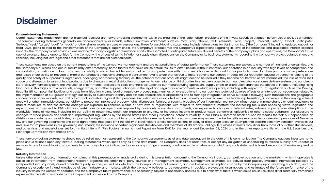 Disclaimer 2 Forward-Looking Statements Certain statements made herein are not historical facts but are “forward-looking statements” within the meaning of the “safe harbor” provisions of the Private Securities Litigation Reform Act of 1995, as amended. The forward-looking statements generally are accompanied by or include, without limitation, statements such as "may," "can," "should," "will," "estimate," "plan," "project," "forecast," "intend," "expect," "anticipate," "believe," "seek," "target," "goal," "on track," or other similar words, phrases or expressions. These forward-looking statements include future plans for Utz Brands, Inc. (“the Company”), including updated outlook for fiscal 2025, plans related to the transformation of the Company’s supply chain, the Company’s product mix, the Company's expectations regarding its level of indebtedness and associated interest expense impacts; the Company’s cost savings plans and the Company’s logistics optimization efforts; the estimated or anticipated future results and benefits of the Company’s plans and operations; the Company’s future capital structure; future opportunities for the Company; the effects of tariffs, inflation or supply chain disruptions on the Company or its business; statements regarding the Company’s project balance sheet and liabilities, including net leverage; and other statements that are not historical facts. These statements are based on the current expectations of the Company’s management and are not predictions of actual performance. These statements are subject to a number of risks and uncertainties, and the Company’s business and actual results may differ materially. Some factors that could cause actual results to differ include, without limitation: our operation in an industry with high levels of competition and consolidation; our reliance on key customers and ability to obtain favorable contractual terms and protections with customers; changes in demand for our products driven by changes in consumer preferences and tastes or our ability to innovate or market our products effectively; changes in consumers’ loyalty to our brands due to factors beyond our control; impacts on our reputation caused by concerns relating to the quality and safety of our products, ingredients, packaging, or processing techniques; the potential that our products might need to be recalled if they become adulterated or are mislabeled; the loss of retail shelf space and disruption to sales of food products due to changes in retail distribution arrangements; our reliance on third parties to effectively operate both our direct-to-warehouse delivery system and our direct- store-delivery network system; the evolution of e-commerce retailers and sales channels; disruption to our manufacturing operations, supply chain, or distribution channels; the effects of inflation, including rising labor costs; shortages of raw materials, energy, water, and other supplies; changes in the legal and regulatory environments in which we operate, including with respect to tax legislation such as the One Big Beautiful Bill Act; potential liabilities and costs from litigation, claims, legal or regulatory proceedings, inquiries, or investigations into our business; potential adverse effects or unintended consequences related to the implementation of our growth strategy; our ability to successfully identify and execute acquisitions or dispositions and to manage integration or carve out issues following such transactions; the geographic concentration of our markets; our ability to attract and retain highly skilled personnel (including risks associated with our recently announced executive leadership transition); impairment in the carrying value of goodwill or other intangible assets; our ability to protect our intellectual property rights; disruptions, failures, or security breaches of our information technology infrastructure; climate change or legal, regulatory or market measures to address climate change; our exposure to liabilities, claims or new laws or regulations with respect to environmental matters; the increasing focus and opposing views, legislation and expectations with respect to ESG initiatives; restrictions on our operations imposed by covenants in our debt instruments; our exposure to changes in interest rates; adverse impacts from disruptions in the worldwide financial markets, including on our ability to obtain new credit; our exposure to any new or increased income or product taxes; pandemics, epidemics or other disease outbreaks; our exposure to changes to trade policies and tariff and import/export regulations by the United States and other jurisdictions; potential volatility in our Class A Common Stock caused by resales thereof; our dependence on distributions made by our subsidiaries; our payment obligations pursuant to a tax receivable agreement, which in certain cases may exceed the tax benefits we realize or be accelerated; provisions of Delaware law and our governing documents and other agreements that could limit the ability of stockholders to take certain actions or delay or discourage takeover attempts that stockholders may consider favorable; our exclusive forum provisions in our governing documents; the influence of certain significant stockholders and members of Utz Brands Holdings, LLC, whose interests may differ from those of our other stockholders; and other risks and uncertainties set forth in Part I, Item 1A “Risk Factors” in our Annual Report on Form 10-K for the year ended December 29, 2024 and in the other reports we file with the U.S. Securities and Exchange Commission from time to time. These forward-looking statements should not be relied upon as representing the Company’s assessments as of any date subsequent to the date of this communication. The Company cautions investors not to place undue reliance upon any forward-looking statements, which speak only as of the date made. The Comp