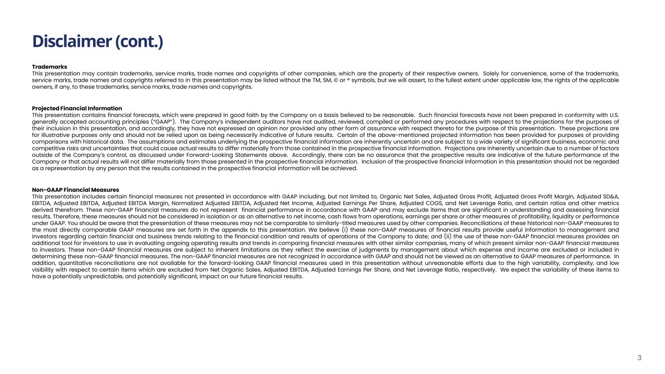 Disclaimer (cont.) 3 Trademarks This presentation may contain trademarks, service marks, trade names and copyrights of other companies, which are the property of their respective owners. Solely for convenience, some of the trademarks, service marks, trade names and copyrights referred to in this presentation may be listed without the TM, SM, © or ® symbols, but we will assert, to the fullest extent under applicable law, the rights of the applicable owners, if any, to these trademarks, service marks, trade names and copyrights. Projected Financial Information This presentation contains financial forecasts, which were prepared in good faith by the Company on a basis believed to be reasonable. Such financial forecasts have not been prepared in conformity with U.S. generally accepted accounting principles (“GAAP”). The Company’s independent auditors have not audited, reviewed, compiled or performed any procedures with respect to the projections for the purposes of their inclusion in this presentation, and accordingly, they have not expressed an opinion nor provided any other form of assurance with respect thereto for the purpose of this presentation. These projections are for illustrative purposes only and should not be relied upon as being necessarily indicative of future results. Certain of the above-mentioned projected information has been provided for purposes of providing comparisons with historical data. The assumptions and estimates underlying the prospective financial information are inherently uncertain and are subject to a wide variety of significant business, economic and competitive risks and uncertainties that could cause actual results to differ materially from those contained in the prospective financial information. Projections are inherently uncertain due to a number of factors outside of the Company’s control, as discussed under Forward-Looking Statements above. Accordingly, there can be no assurance that the prospective results are indicative of the future performance of the Company or that actual results will not differ materially from those presented in the prospective financial information. Inclusion of the prospective financial information in this presentation should not be regarded as a representation by any person that the results contained in the prospective financial information will be achieved. Non-GAAP Financial Measures This presentation includes certain financial measures not presented in accordance with GAAP including, but not limited to, Organic Net Sales, Adjusted Gross Profit, Adjusted Gross Profit Margin, Adjusted SD&A, EBITDA, Adjusted EBITDA, Adjusted EBITDA Margin, Normalized Adjusted EBITDA, Adjusted Net Income, Adjusted Earnings Per Share, Adjusted COGS, and Net Leverage Ratio, and certain ratios and other metrics derived therefrom. These non-GAAP financial measures do not represent financial performance in accordance with GAAP and may exclude items that are significant in understanding and assessing financial results. Therefore, these measures should not be considered in isolation or as an alternative to net income, cash flows from operations, earnings per share or other measures of profitability, liquidity or performance under GAAP. You should be aware that the presentation of these measures may not be comparable to similarly-titled measures used by other companies. Reconciliations of these historical non-GAAP measures to the most directly comparable GAAP measures are set forth in the appendix to this presentation. We believe (i) these non-GAAP measures of financial results provide useful information to management and investors regarding certain financial and business trends relating to the financial condition and results of operations of the Company to date; and (ii) the use of these non-GAAP financial measures provides an additional tool for investors to use in evaluating ongoing operating results and trends in comparing financial measures with other similar companies, many of which present similar non-GAAP financial measures to investors. These non-GAAP financial measures are subject to inherent limitations as they reflect the exercise of judgments by management about which expense and income are excluded or included in determining these non-GAAP financial measures. The non-GAAP financial measures are not recognized in accordance with GAAP and should not be viewed as an alternative to GAAP measures of performance. In addition, quantitative reconciliations are not available for the forward-looking GAAP financial measures used in this presentation without unreasonable efforts due to the high variability, complexity, and low visibility with respect to certain items which are excluded from Net Organic Sales, Adjusted EBITDA, Adjusted Earnings Per Share, and Net Leverage Ratio, respectively. We expect the variability of these items to have a potentially unpredictable, and potentially significant, impact on our future financial results.