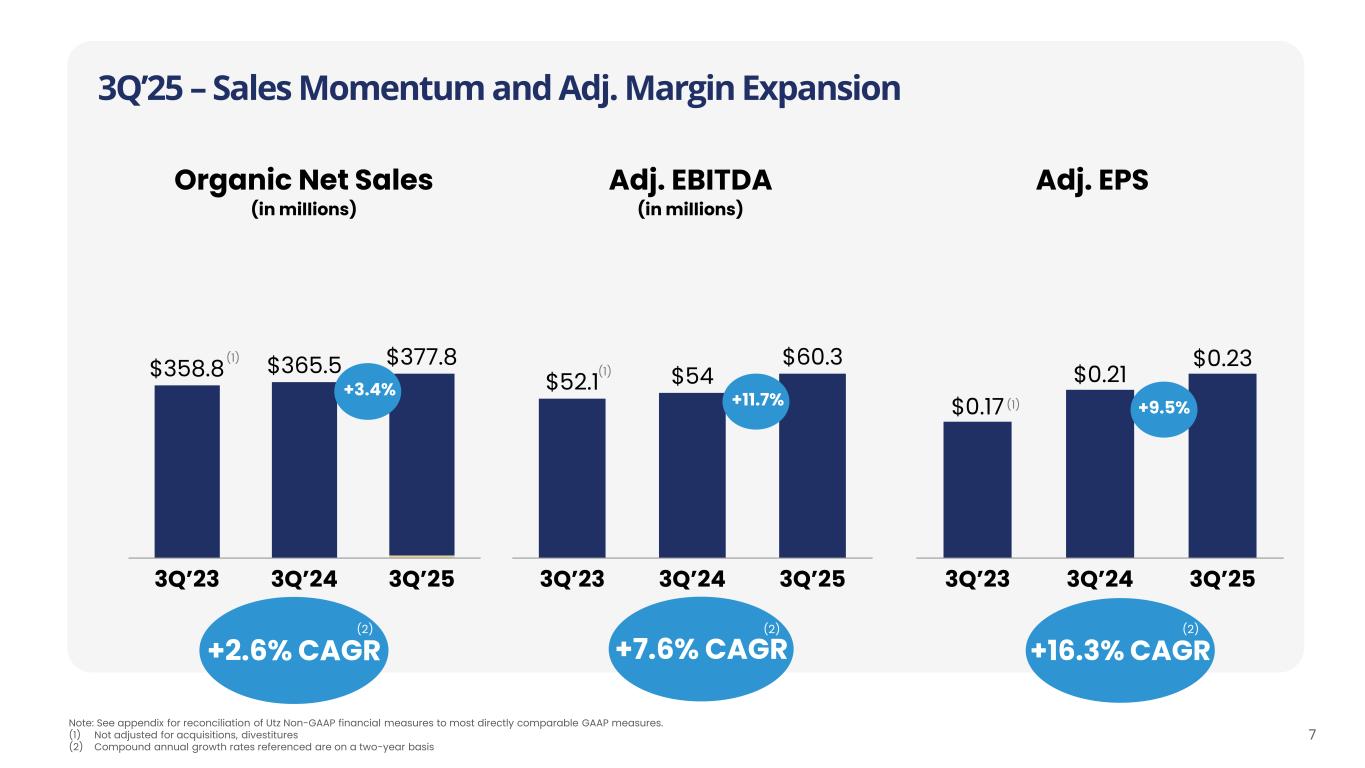 6 California Expansion Strategy o Insignia direct store delivery (DSD) transaction includes routes across California and the Midwest o Proven strategy of route acquisitions in expansion geographies, bringing our playbook to the West Coast o Accelerates Utz’s expansion in California, a key geography with significant white space o Utz currently has ~$79M Retail Sales in California via direct-to- warehouse and other distribution partners o Included in the Company’s 2025 guidance o Will begin to introduce Utz products on DSD routes in early 2026 Sizing the Opportunity % of Salty Snacks consumed in US Utz Market Share (%) Core Expansion California 6.6% 3.0% 1.9% Lowest Utz state- level market share ~$41.4B Total Salty Snacks Consumption in US Source: Retail sales are Circana Total US MULO+ w/convenience, custom Utz Brands hierarchy, 52-weeks ended 9/28/25 (1) Unreported includes sales in Circana Total US MULO+ w/ convenience not allocated to State-level data 52.9% 35.6% 10.0% Expansion Markets (ex. CA) Core Markets California 1.5% Unreported California is the largest Salty Snack market nationally (1)