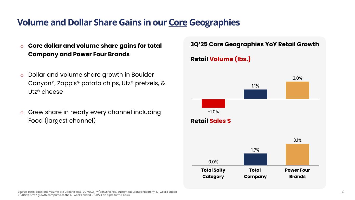 Our Power Four Brands Continue to Gain Share in 3Q’25 11 3Q’25 MULO+ w/Convenience YoY Growth -1.2% 3.0% 4.4% Retail Volume (lbs.) Total Salty Category Total Company Power Four Brands 1.1% 1.8% 2.6% Retail Price/lb. -0.2% 4.8% 7.1% Retail Sales $ Source: Retail sales and volume are Circana Total US MULO+ w/convenience, custom Utz Brands hierarchy, 13-weeks ended 9/28/25; % YoY growth compared to the 13-weeks ended 9/29/24 on a pro forma basis. (1) Measured using MULO+ w/Convenience and Company 3Q’25 internal Net Sales data. May not sum due to rounding o Dollar and volume share gains for total Company and Power Four Brands, driven by Boulder Canyon® o Growth led by Expansion Geographies driven by distribution and velocity gains o Retail price per pound increased primarily due to channel and product mix