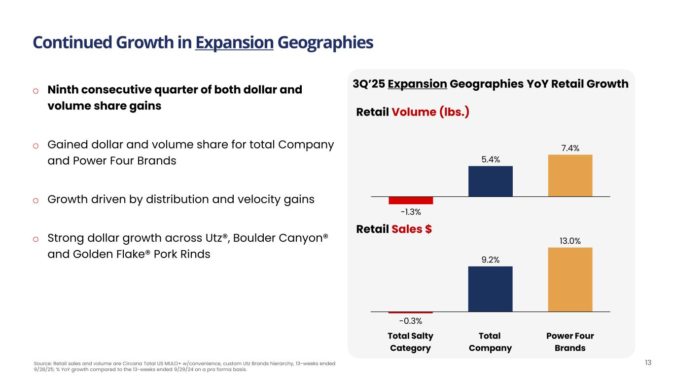 3Q’25 Core Geographies YoY Retail Growth Retail Volume (lbs.) Source: Retail sales and volume are Circana Total US MULO+ w/convenience, custom Utz Brands hierarchy, 13-weeks ended 9/28/25; % YoY growth compared to the 13-weeks ended 9/29/24 on a pro forma basis. Volume and Dollar Share Gains in our Core Geographies 12 Total Salty Category Total Company Power Four Brands 0.0% 1.7% 3.1% -1.0% 1.1% 2.0% Retail Sales $ o Core dollar and volume share gains for total Company and Power Four Brands o Dollar and volume share growth in Boulder Canyon®, Zapp’s® potato chips, Utz® pretzels, & Utz® cheese o Grew share in nearly every channel including Food (largest channel)