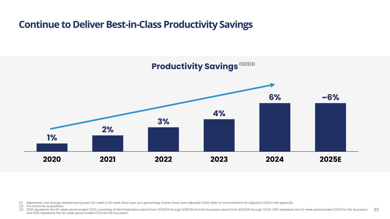 Continue to Deliver Best-in-Class Productivity Savings 23 Productivity Savings (1) Represents cost savings realized during each 52-week or 53-week fiscal year as a percentage of prior fiscal year Adjusted COGS. Refer to reconciliations for Adjusted COGS in the appendix. (2) Pro Forma for acquisitions. (3) 2020 represents the 53-week period ended 1/3/21, consisting of the Predecessor period from 12/30/19 through 8/28/20 and the Successor period from 8/29/20 through 1/3/21; 2021 represents the 52-week period ended 1/2/22 for the Successor; and 2022 represents the 52-week period ended 1/1/23 for the Successor. 2020 2021 2022 2023 2024 2025E 1% 2% 3% 4% 6% ~6% (1)(2)(3)
