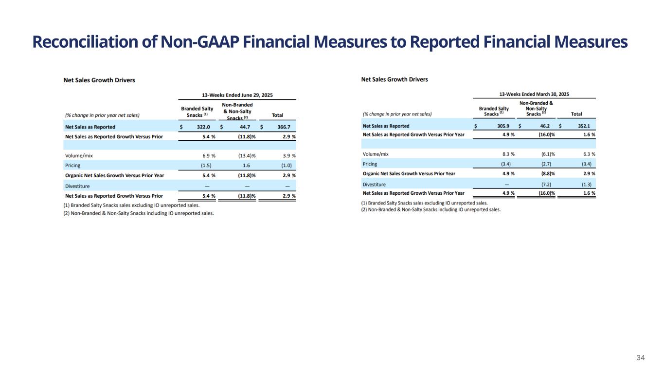 Note: Quantitative reconciliations are not available for the forward-looking Non-GAAP financial measures used herein without unreasonable efforts due to the high variability, complexity, and low visibility with respect to certain items which are excluded from Organic Net Sales, Adjusted EBITDA, Net Leverage Ratio, normalized GAAP basis tax expense, excluding one-time items, and Adjusted Earnings Per Share, respectively. We expect the variability of these items to have a potentially unpredictable, and potentially significant, impact on our future financial results. (1) Normalized GAAP basis tax expense, which excludes one-time items. FY’25 Expected Growth vs. FY’24 Actual Results New Previous Key Assumptions Organic Net Sales ~+3% +2.5% or better Continued Branded Salty Snacks growth, particularly the Power Four Brands, reflecting YTD outperformance through 3Q’25 Adj. EBITDA Unchanged +7% to +10% Strong Adj. Gross Profit Margin expansion fueled by productivity savings and better volumes. Adj. EBITDA second half weighted due to normal seasonality, timing of investments and productivity savings Adj. EPS Unchanged +7% to +10% Adj. EPS growth in-line with Adj. EBITDA growth Additional Outlook Assumptions: Effective Normalized Tax Rate(1) Unchanged 17% to 19% Consistent with 2024 Interest Expense Unchanged ~$46m Long-term debt blended rate of ~5% Capital Expenditures Unchanged ~$100m Majority focused on building increased manufacturing network capacity and delivering productivity savings. Timing first half weighted and accelerated due to further supply chain optimization Net Leverage Ratio Unchanged Approaching 3x at YE’25 Adj. EBITDA growth and modest scheduled debt repayment Updating Full Year 2025 Outlook 24