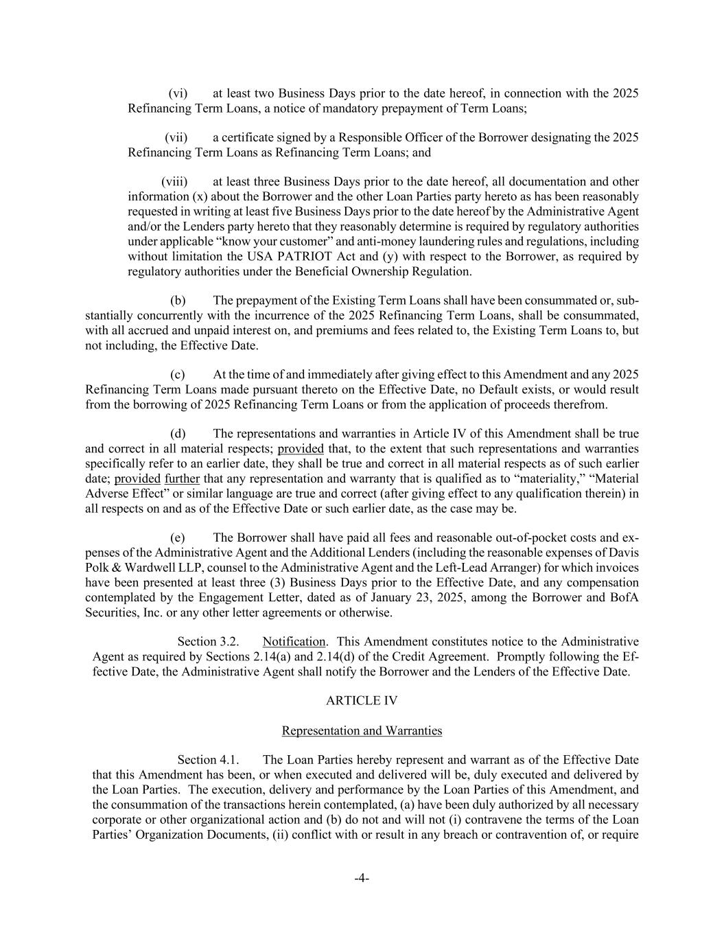 -4- (vi) at least two Business Days prior to the date hereof, in connection with the 2025 Refinancing Term Loans, a notice of mandatory prepayment of Term Loans; (vii) a certificate signed by a Responsible Officer of the Borrower designating the 2025 Refinancing Term Loans as Refinancing Term Loans; and (viii) at least three Business Days prior to the date hereof, all documentation and other information (x) about the Borrower and the other Loan Parties party hereto as has been reasonably requested in writing at least five Business Days prior to the date hereof by the Administrative Agent and/or the Lenders party hereto that they reasonably determine is required by regulatory authorities under applicable “know your customer” and anti-money laundering rules and regulations, including without limitation the USA PATRIOT Act and (y) with respect to the Borrower, as required by regulatory authorities under the Beneficial Ownership Regulation. (b) The prepayment of the Existing Term Loans shall have been consummated or, sub- stantially concurrently with the incurrence of the 2025 Refinancing Term Loans, shall be consummated, with all accrued and unpaid interest on, and premiums and fees related to, the Existing Term Loans to, but not including, the Effective Date. (c) At the time of and immediately after giving effect to this Amendment and any 2025 Refinancing Term Loans made pursuant thereto on the Effective Date, no Default exists, or would result from the borrowing of 2025 Refinancing Term Loans or from the application of proceeds therefrom. (d) The representations and warranties in Article IV of this Amendment shall be true and correct in all material respects; provided that, to the extent that such representations and warranties specifically refer to an earlier date, they shall be true and correct in all material respects as of such earlier date; provided further that any representation and warranty that is qualified as to “materiality,” “Material Adverse Effect” or similar language are true and correct (after giving effect to any qualification therein) in all respects on and as of the Effective Date or such earlier date, as the case may be. (e) The Borrower shall have paid all fees and reasonable out-of-pocket costs and ex- penses of the Administrative Agent and the Additional Lenders (including the reasonable expenses of Davis Polk & Wardwell LLP, counsel to the Administrative Agent and the Left-Lead Arranger) for which invoices have been presented at least three (3) Business Days prior to the Effective Date, and any compensation contemplated by the Engagement Letter, dated as of January 23, 2025, among the Borrower and BofA Securities, Inc. or any other letter agreements or otherwise. Section 3.2. Notification. This Amendment constitutes notice to the Administrative Agent as required by Sections 2.14(a) and 2.14(d) of the Credit Agreement. Promptly following the Ef- fective Date, the Administrative Agent shall notify the Borrower and the Lenders of the Effective Date. ARTICLE IV Representation and Warranties Section 4.1. The Loan Parties hereby represent and warrant as of the Effective Date that this Amendment has been, or when executed and delivered will be, duly executed and delivered by the Loan Parties. The execution, delivery and performance by the Loan Parties of this Amendment, and the consummation of the transactions herein contemplated, (a) have been duly authorized by all necessary corporate or other organizational action and (b) do not and will not (i) contravene the terms of the Loan Parties’ Organization Documents, (ii) conflict with or result in any breach or contravention of, or require