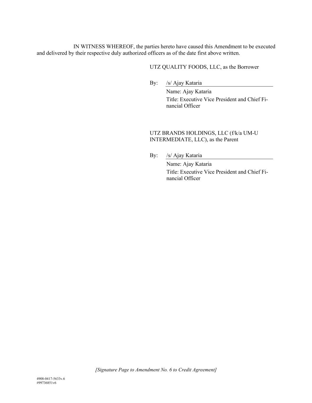 [Signature Page to Amendment No. 6 to Credit Agreement] 4908-0417-5633v.6 #99736851v6 IN WITNESS WHEREOF, the parties hereto have caused this Amendment to be executed and delivered by their respective duly authorized officers as of the date first above written. UTZ QUALITY FOODS, LLC, as the Borrower By: /s/ Ajay Kataria Name: Ajay Kataria Title: Executive Vice President and Chief Fi- nancial Officer UTZ BRANDS HOLDINGS, LLC (f/k/a UM-U INTERMEDIATE, LLC), as the Parent By: /s/ Ajay Kataria Name: Ajay Kataria Title: Executive Vice President and Chief Fi- nancial Officer