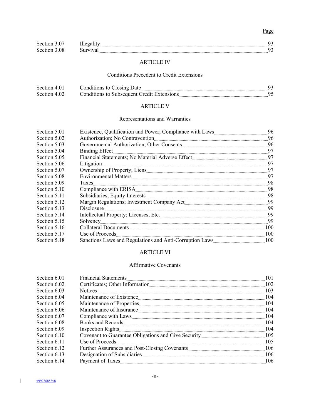 Page Section 3.07 Illegality 93 Section 3.08 Survival 93 ARTICLE IV Conditions Precedent to Credit Extensions Section 4.01 Conditions to Closing Date 93 Section 4.02 Conditions to Subsequent Credit Extensions 95 ARTICLE V Representations and Warranties Section 5.01 Existence, Qualification and Power; Compliance with Laws 96 Section 5.02 Authorization; No Contravention 96 Section 5.03 Governmental Authorization; Other Consents 96 Section 5.04 Binding Effect 97 Section 5.05 Financial Statements; No Material Adverse Effect 97 Section 5.06 Litigation 97 Section 5.07 Ownership of Property; Liens 97 Section 5.08 Environmental Matters 97 Section 5.09 Taxes 98 Section 5.10 Compliance with ERISA 98 Section 5.11 Subsidiaries; Equity Interests 98 Section 5.12 Margin Regulations; Investment Company Act 99 Section 5.13 Disclosure 99 Section 5.14 Intellectual Property; Licenses, Etc. 99 Section 5.15 Solvency 99 Section 5.16 Collateral Documents 100 Section 5.17 Use of Proceeds 100 Section 5.18 Sanctions Laws and Regulations and Anti-Corruption Laws 100 ARTICLE VI Affirmative Covenants Section 6.01 Financial Statements 101 Section 6.02 Certificates; Other Information 102 Section 6.03 Notices 103 Section 6.04 Maintenance of Existence 104 Section 6.05 Maintenance of Properties 104 Section 6.06 Maintenance of Insurance 104 Section 6.07 Compliance with Laws 104 Section 6.08 Books and Records 104 Section 6.09 Inspection Rights 104 Section 6.10 Covenant to Guarantee Obligations and Give Security 105 Section 6.11 Use of Proceeds 105 Section 6.12 Further Assurances and Post-Closing Covenants 106 Section 6.13 Designation of Subsidiaries 106 Section 6.14 Payment of Taxes 106 -ii- #99736853v8