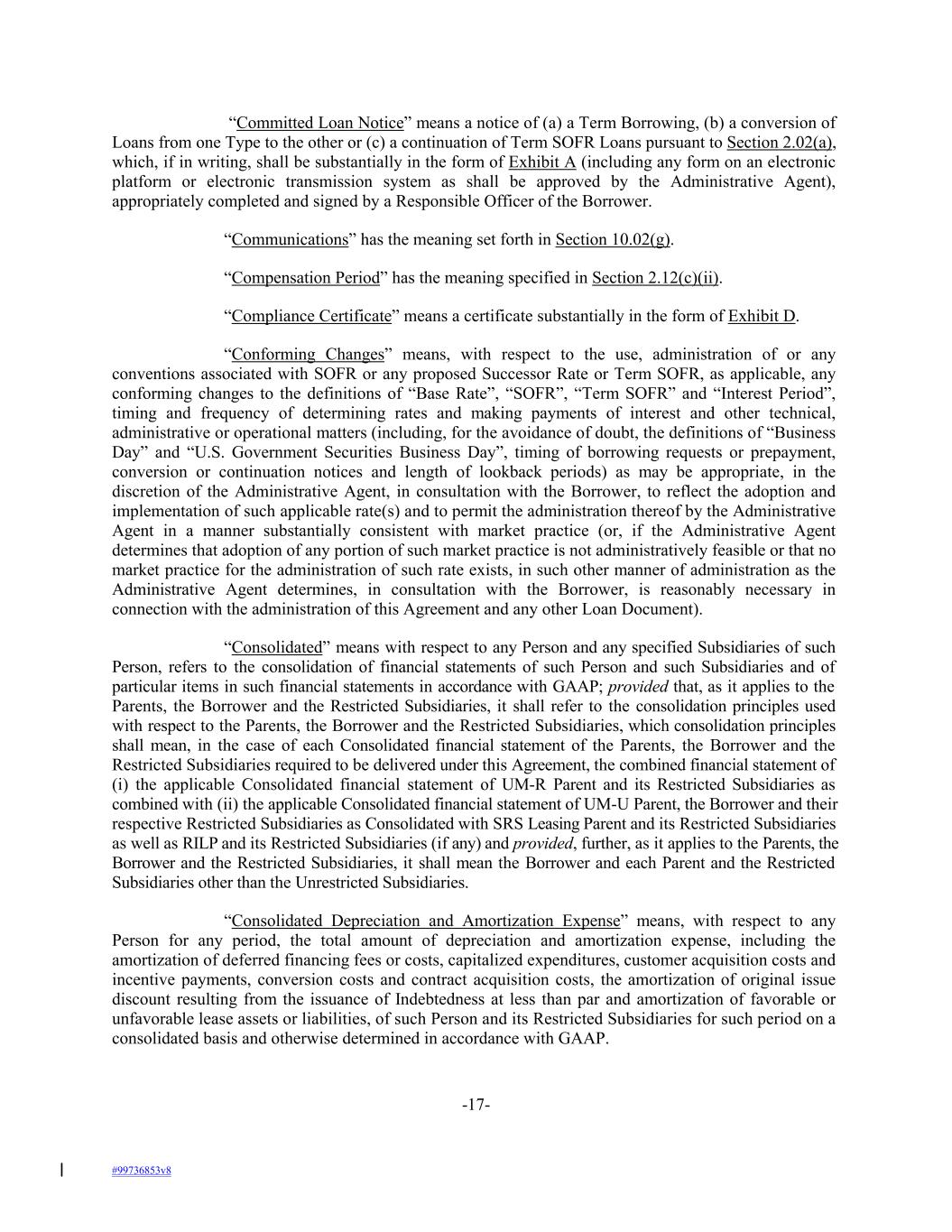 “Committed Loan Notice” means a notice of (a) a Term Borrowing, (b) a conversion of Loans from one Type to the other or (c) a continuation of Term SOFR Loans pursuant to Section 2.02(a), which, if in writing, shall be substantially in the form of Exhibit A (including any form on an electronic platform or electronic transmission system as shall be approved by the Administrative Agent), appropriately completed and signed by a Responsible Officer of the Borrower. “Communications” has the meaning set forth in Section 10.02(g). “Compensation Period” has the meaning specified in Section 2.12(c)(ii). “Compliance Certificate” means a certificate substantially in the form of Exhibit D. “Conforming Changes” means, with respect to the use, administration of or any conventions associated with SOFR or any proposed Successor Rate or Term SOFR, as applicable, any conforming changes to the definitions of “Base Rate”, “SOFR”, “Term SOFR” and “Interest Period”, timing and frequency of determining rates and making payments of interest and other technical, administrative or operational matters (including, for the avoidance of doubt, the definitions of “Business Day” and “U.S. Government Securities Business Day”, timing of borrowing requests or prepayment, conversion or continuation notices and length of lookback periods) as may be appropriate, in the discretion of the Administrative Agent, in consultation with the Borrower, to reflect the adoption and implementation of such applicable rate(s) and to permit the administration thereof by the Administrative Agent in a manner substantially consistent with market practice (or, if the Administrative Agent determines that adoption of any portion of such market practice is not administratively feasible or that no market practice for the administration of such rate exists, in such other manner of administration as the Administrative Agent determines, in consultation with the Borrower, is reasonably necessary in connection with the administration of this Agreement and any other Loan Document). “Consolidated” means with respect to any Person and any specified Subsidiaries of such Person, refers to the consolidation of financial statements of such Person and such Subsidiaries and of particular items in such financial statements in accordance with GAAP; provided that, as it applies to the Parents, the Borrower and the Restricted Subsidiaries, it shall refer to the consolidation principles used with respect to the Parents, the Borrower and the Restricted Subsidiaries, which consolidation principles shall mean, in the case of each Consolidated financial statement of the Parents, the Borrower and the Restricted Subsidiaries required to be delivered under this Agreement, the combined financial statement of (i) the applicable Consolidated financial statement of UM-R Parent and its Restricted Subsidiaries as combined with (ii) the applicable Consolidated financial statement of UM-U Parent, the Borrower and their respective Restricted Subsidiaries as Consolidated with SRS Leasing Parent and its Restricted Subsidiaries as well as RILP and its Restricted Subsidiaries (if any) and provided, further, as it applies to the Parents, the Borrower and the Restricted Subsidiaries, it shall mean the Borrower and each Parent and the Restricted Subsidiaries other than the Unrestricted Subsidiaries. “Consolidated Depreciation and Amortization Expense” means, with respect to any Person for any period, the total amount of depreciation and amortization expense, including the amortization of deferred financing fees or costs, capitalized expenditures, customer acquisition costs and incentive payments, conversion costs and contract acquisition costs, the amortization of original issue discount resulting from the issuance of Indebtedness at less than par and amortization of favorable or unfavorable lease assets or liabilities, of such Person and its Restricted Subsidiaries for such period on a consolidated basis and otherwise determined in accordance with GAAP. -17- #99736853v8