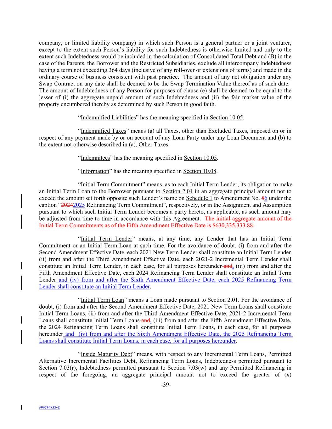 company, or limited liability company) in which such Person is a general partner or a joint venturer, except to the extent such Person’s liability for such Indebtedness is otherwise limited and only to the extent such Indebtedness would be included in the calculation of Consolidated Total Debt and (B) in the case of the Parents, the Borrower and the Restricted Subsidiaries, exclude all intercompany Indebtedness having a term not exceeding 364 days (inclusive of any roll-over or extensions of terms) and made in the ordinary course of business consistent with past practice. The amount of any net obligation under any Swap Contract on any date shall be deemed to be the Swap Termination Value thereof as of such date. The amount of Indebtedness of any Person for purposes of clause (e) shall be deemed to be equal to the lesser of (i) the aggregate unpaid amount of such Indebtedness and (ii) the fair market value of the property encumbered thereby as determined by such Person in good faith. “Indemnified Liabilities” has the meaning specified in Section 10.05. “Indemnified Taxes” means (a) all Taxes, other than Excluded Taxes, imposed on or in respect of any payment made by or on account of any Loan Party under any Loan Document and (b) to the extent not otherwise described in (a), Other Taxes. “Indemnitees” has the meaning specified in Section 10.05. “Information” has the meaning specified in Section 10.08. “Initial Term Commitment” means, as to each Initial Term Lender, its obligation to make an Initial Term Loan to the Borrower pursuant to Section 2.01 in an aggregate principal amount not to exceed the amount set forth opposite such Lender’s name on Schedule 1 to Amendment No. 56 under the caption “20242025 Refinancing Term Commitment”, respectively, or in the Assignment and Assumption pursuant to which such Initial Term Lender becomes a party hereto, as applicable, as such amount may be adjusted from time to time in accordance with this Agreement. The initial aggregate amount of the Initial Term Commitments as of the Fifth Amendment Effective Date is $630,335,333.88. “Initial Term Lender” means, at any time, any Lender that has an Initial Term Commitment or an Initial Term Loan at such time. For the avoidance of doubt, (i) from and after the Second Amendment Effective Date, each 2021 New Term Lender shall constitute an Initial Term Lender, (ii) from and after the Third Amendment Effective Date, each 2021-2 Incremental Term Lender shall constitute an Initial Term Lender, in each case, for all purposes hereunder and, (iii) from and after the Fifth Amendment Effective Date, each 2024 Refinancing Term Lender shall constitute an Initial Term Lender and (iv) from and after the Sixth Amendment Effective Date, each 2025 Refinancing Term Lender shall constitute an Initial Term Lender. “Initial Term Loan” means a Loan made pursuant to Section 2.01. For the avoidance of doubt, (i) from and after the Second Amendment Effective Date, 2021 New Term Loans shall constitute Initial Term Loans, (ii) from and after the Third Amendment Effective Date, 2021-2 Incremental Term Loans shall constitute Initial Term Loans and, (iii) from and after the Fifth Amendment Effective Date, the 2024 Refinancing Term Loans shall constitute Initial Term Loans, in each case, for all purposes hereunder and (iv) from and after the Sixth Amendment Effective Date, the 2025 Refinancing Term Loans shall constitute Initial Term Loans, in each case, for all purposes hereunder. “Inside Maturity Debt” means, with respect to any Incremental Term Loans, Permitted Alternative Incremental Facilities Debt, Refinancing Term Loans, Indebtedness permitted pursuant to Section 7.03(r), Indebtedness permitted pursuant to Section 7.03(w) and any Permitted Refinancing in respect of the foregoing, an aggregate principal amount not to exceed the greater of (x) -39- #99736853v8