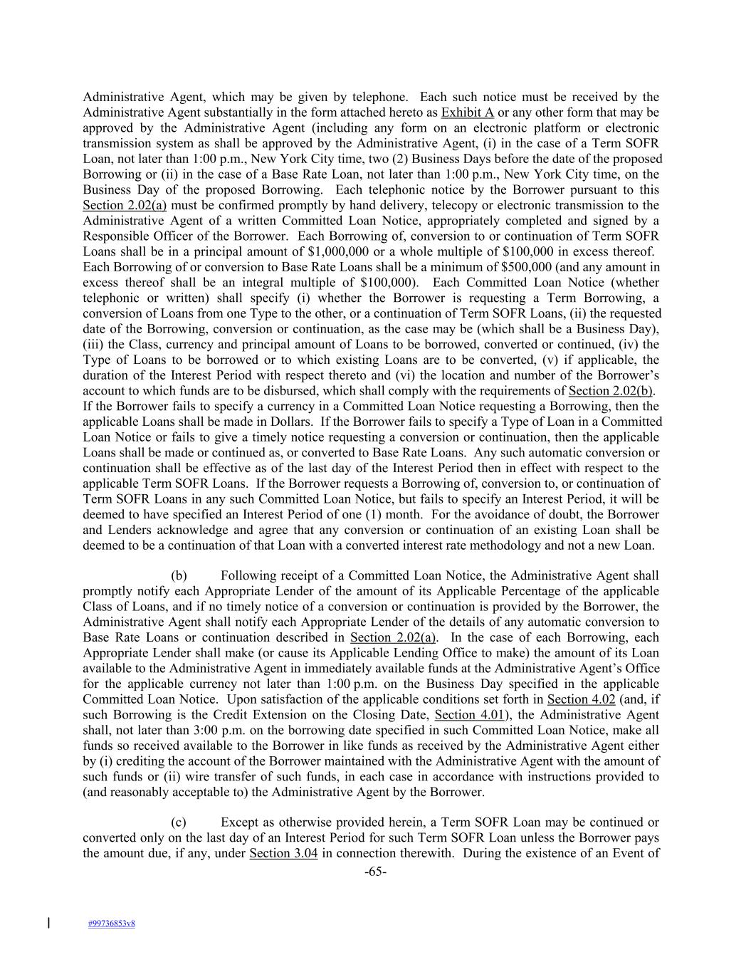 Administrative Agent, which may be given by telephone. Each such notice must be received by the Administrative Agent substantially in the form attached hereto as Exhibit A or any other form that may be approved by the Administrative Agent (including any form on an electronic platform or electronic transmission system as shall be approved by the Administrative Agent, (i) in the case of a Term SOFR Loan, not later than 1:00 p.m., New York City time, two (2) Business Days before the date of the proposed Borrowing or (ii) in the case of a Base Rate Loan, not later than 1:00 p.m., New York City time, on the Business Day of the proposed Borrowing. Each telephonic notice by the Borrower pursuant to this Section 2.02(a) must be confirmed promptly by hand delivery, telecopy or electronic transmission to the Administrative Agent of a written Committed Loan Notice, appropriately completed and signed by a Responsible Officer of the Borrower. Each Borrowing of, conversion to or continuation of Term SOFR Loans shall be in a principal amount of $1,000,000 or a whole multiple of $100,000 in excess thereof. Each Borrowing of or conversion to Base Rate Loans shall be a minimum of $500,000 (and any amount in excess thereof shall be an integral multiple of $100,000). Each Committed Loan Notice (whether telephonic or written) shall specify (i) whether the Borrower is requesting a Term Borrowing, a conversion of Loans from one Type to the other, or a continuation of Term SOFR Loans, (ii) the requested date of the Borrowing, conversion or continuation, as the case may be (which shall be a Business Day), (iii) the Class, currency and principal amount of Loans to be borrowed, converted or continued, (iv) the Type of Loans to be borrowed or to which existing Loans are to be converted, (v) if applicable, the duration of the Interest Period with respect thereto and (vi) the location and number of the Borrower’s account to which funds are to be disbursed, which shall comply with the requirements of Section 2.02(b). If the Borrower fails to specify a currency in a Committed Loan Notice requesting a Borrowing, then the applicable Loans shall be made in Dollars. If the Borrower fails to specify a Type of Loan in a Committed Loan Notice or fails to give a timely notice requesting a conversion or continuation, then the applicable Loans shall be made or continued as, or converted to Base Rate Loans. Any such automatic conversion or continuation shall be effective as of the last day of the Interest Period then in effect with respect to the applicable Term SOFR Loans. If the Borrower requests a Borrowing of, conversion to, or continuation of Term SOFR Loans in any such Committed Loan Notice, but fails to specify an Interest Period, it will be deemed to have specified an Interest Period of one (1) month. For the avoidance of doubt, the Borrower and Lenders acknowledge and agree that any conversion or continuation of an existing Loan shall be deemed to be a continuation of that Loan with a converted interest rate methodology and not a new Loan. (b) Following receipt of a Committed Loan Notice, the Administrative Agent shall promptly notify each Appropriate Lender of the amount of its Applicable Percentage of the applicable Class of Loans, and if no timely notice of a conversion or continuation is provided by the Borrower, the Administrative Agent shall notify each Appropriate Lender of the details of any automatic conversion to Base Rate Loans or continuation described in Section 2.02(a). In the case of each Borrowing, each Appropriate Lender shall make (or cause its Applicable Lending Office to make) the amount of its Loan available to the Administrative Agent in immediately available funds at the Administrative Agent’s Office for the applicable currency not later than 1:00 p.m. on the Business Day specified in the applicable Committed Loan Notice. Upon satisfaction of the applicable conditions set forth in Section 4.02 (and, if such Borrowing is the Credit Extension on the Closing Date, Section 4.01), the Administrative Agent shall, not later than 3:00 p.m. on the borrowing date specified in such Committed Loan Notice, make all funds so received available to the Borrower in like funds as received by the Administrative Agent either by (i) crediting the account of the Borrower maintained with the Administrative Agent with the amount of such funds or (ii) wire transfer of such funds, in each case in accordance with instructions provided to (and reasonably acceptable to) the Administrative Agent by the Borrower. (c) Except as otherwise provided herein, a Term SOFR Loan may be continued or converted only on the last day of an Interest Period for such Term SOFR Loan unless the Borrower pays the amount due, if any, under Section 3.04 in connection therewith. During the existence of an Event of -65- #99736853v8