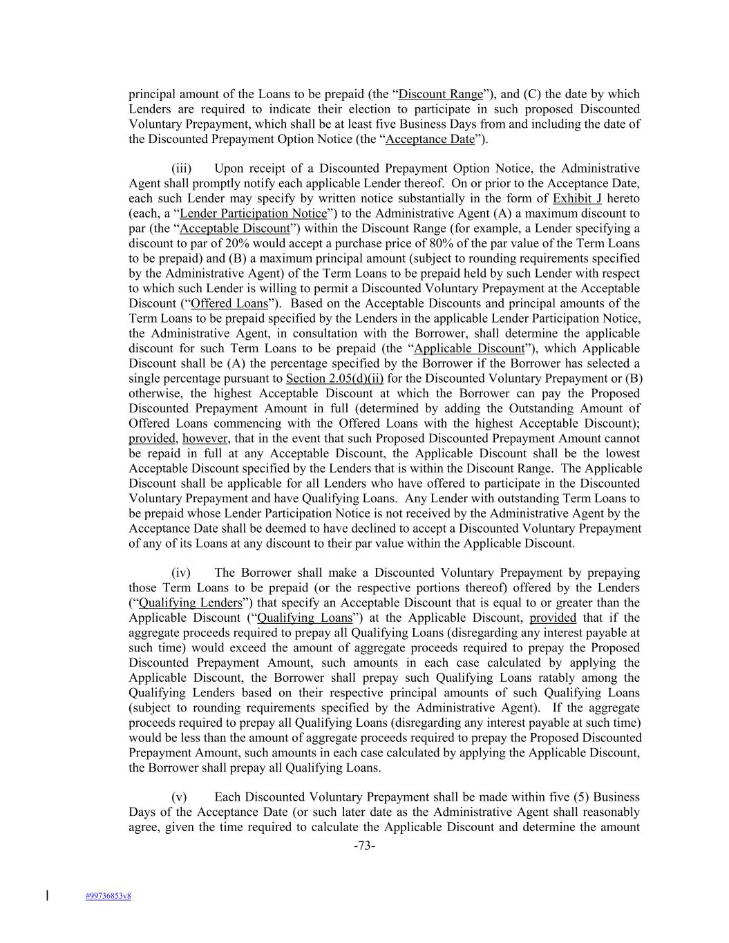 principal amount of the Loans to be prepaid (the “Discount Range”), and (C) the date by which Lenders are required to indicate their election to participate in such proposed Discounted Voluntary Prepayment, which shall be at least five Business Days from and including the date of the Discounted Prepayment Option Notice (the “Acceptance Date”). (iii) Upon receipt of a Discounted Prepayment Option Notice, the Administrative Agent shall promptly notify each applicable Lender thereof. On or prior to the Acceptance Date, each such Lender may specify by written notice substantially in the form of Exhibit J hereto (each, a “Lender Participation Notice”) to the Administrative Agent (A) a maximum discount to par (the “Acceptable Discount”) within the Discount Range (for example, a Lender specifying a discount to par of 20% would accept a purchase price of 80% of the par value of the Term Loans to be prepaid) and (B) a maximum principal amount (subject to rounding requirements specified by the Administrative Agent) of the Term Loans to be prepaid held by such Lender with respect to which such Lender is willing to permit a Discounted Voluntary Prepayment at the Acceptable Discount (“Offered Loans”). Based on the Acceptable Discounts and principal amounts of the Term Loans to be prepaid specified by the Lenders in the applicable Lender Participation Notice, the Administrative Agent, in consultation with the Borrower, shall determine the applicable discount for such Term Loans to be prepaid (the “Applicable Discount”), which Applicable Discount shall be (A) the percentage specified by the Borrower if the Borrower has selected a single percentage pursuant to Section 2.05(d)(ii) for the Discounted Voluntary Prepayment or (B) otherwise, the highest Acceptable Discount at which the Borrower can pay the Proposed Discounted Prepayment Amount in full (determined by adding the Outstanding Amount of Offered Loans commencing with the Offered Loans with the highest Acceptable Discount); provided, however, that in the event that such Proposed Discounted Prepayment Amount cannot be repaid in full at any Acceptable Discount, the Applicable Discount shall be the lowest Acceptable Discount specified by the Lenders that is within the Discount Range. The Applicable Discount shall be applicable for all Lenders who have offered to participate in the Discounted Voluntary Prepayment and have Qualifying Loans. Any Lender with outstanding Term Loans to be prepaid whose Lender Participation Notice is not received by the Administrative Agent by the Acceptance Date shall be deemed to have declined to accept a Discounted Voluntary Prepayment of any of its Loans at any discount to their par value within the Applicable Discount. (iv) The Borrower shall make a Discounted Voluntary Prepayment by prepaying those Term Loans to be prepaid (or the respective portions thereof) offered by the Lenders (“Qualifying Lenders”) that specify an Acceptable Discount that is equal to or greater than the Applicable Discount (“Qualifying Loans”) at the Applicable Discount, provided that if the aggregate proceeds required to prepay all Qualifying Loans (disregarding any interest payable at such time) would exceed the amount of aggregate proceeds required to prepay the Proposed Discounted Prepayment Amount, such amounts in each case calculated by applying the Applicable Discount, the Borrower shall prepay such Qualifying Loans ratably among the Qualifying Lenders based on their respective principal amounts of such Qualifying Loans (subject to rounding requirements specified by the Administrative Agent). If the aggregate proceeds required to prepay all Qualifying Loans (disregarding any interest payable at such time) would be less than the amount of aggregate proceeds required to prepay the Proposed Discounted Prepayment Amount, such amounts in each case calculated by applying the Applicable Discount, the Borrower shall prepay all Qualifying Loans. (v) Each Discounted Voluntary Prepayment shall be made within five (5) Business Days of the Acceptance Date (or such later date as the Administrative Agent shall reasonably agree, given the time required to calculate the Applicable Discount and determine the amount -73- #99736853v8