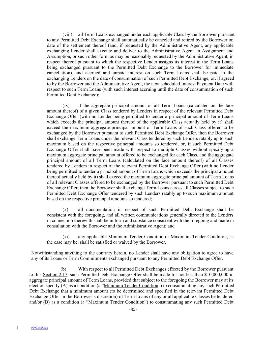 (viii) all Term Loans exchanged under each applicable Class by the Borrower pursuant to any Permitted Debt Exchange shall automatically be canceled and retired by the Borrower on date of the settlement thereof (and, if requested by the Administrative Agent, any applicable exchanging Lender shall execute and deliver to the Administrative Agent an Assignment and Assumption, or such other form as may be reasonably requested by the Administrative Agent, in respect thereof pursuant to which the respective Lender assigns its interest in the Term Loans being exchanged pursuant to the Permitted Debt Exchange to the Borrower for immediate cancellation), and accrued and unpaid interest on such Term Loans shall be paid to the exchanging Lenders on the date of consummation of such Permitted Debt Exchange, or, if agreed to by the Borrower and the Administrative Agent, the next scheduled Interest Payment Date with respect to such Term Loans (with such interest accruing until the date of consummation of such Permitted Debt Exchange); (ix) if the aggregate principal amount of all Term Loans (calculated on the face amount thereof) of a given Class tendered by Lenders in respect of the relevant Permitted Debt Exchange Offer (with no Lender being permitted to tender a principal amount of Term Loans which exceeds the principal amount thereof of the applicable Class actually held by it) shall exceed the maximum aggregate principal amount of Term Loans of such Class offered to be exchanged by the Borrower pursuant to such Permitted Debt Exchange Offer, then the Borrower shall exchange Term Loans under the relevant Class tendered by such Lenders ratably up to such maximum based on the respective principal amounts so tendered, or, if such Permitted Debt Exchange Offer shall have been made with respect to multiple Classes without specifying a maximum aggregate principal amount offered to be exchanged for each Class, and the aggregate principal amount of all Term Loans (calculated on the face amount thereof) of all Classes tendered by Lenders in respect of the relevant Permitted Debt Exchange Offer (with no Lender being permitted to tender a principal amount of Term Loans which exceeds the principal amount thereof actually held by it) shall exceed the maximum aggregate principal amount of Term Loans of all relevant Classes offered to be exchanged by the Borrower pursuant to such Permitted Debt Exchange Offer, then the Borrower shall exchange Term Loans across all Classes subject to such Permitted Debt Exchange Offer tendered by such Lenders ratably up to such maximum amount based on the respective principal amounts so tendered; (x) all documentation in respect of such Permitted Debt Exchange shall be consistent with the foregoing, and all written communications generally directed to the Lenders in connection therewith shall be in form and substance consistent with the foregoing and made in consultation with the Borrower and the Administrative Agent; and (xi) any applicable Minimum Tender Condition or Maximum Tender Condition, as the case may be, shall be satisfied or waived by the Borrower. Notwithstanding anything to the contrary herein, no Lender shall have any obligation to agree to have any of its Loans or Term Commitments exchanged pursuant to any Permitted Debt Exchange Offer. (b) With respect to all Permitted Debt Exchanges effected by the Borrower pursuant to this Section 2.17, such Permitted Debt Exchange Offer shall be made for not less than $10,000,000 in aggregate principal amount of Term Loans, provided that subject to the foregoing the Borrower may at its election specify (A) as a condition (a “Minimum Tender Condition”) to consummating any such Permitted Debt Exchange that a minimum amount (to be determined and specified in the relevant Permitted Debt Exchange Offer in the Borrower’s discretion) of Term Loans of any or all applicable Classes be tendered and/or (B) as a condition (a “Maximum Tender Condition”) to consummating any such Permitted Debt -85- #99736853v8