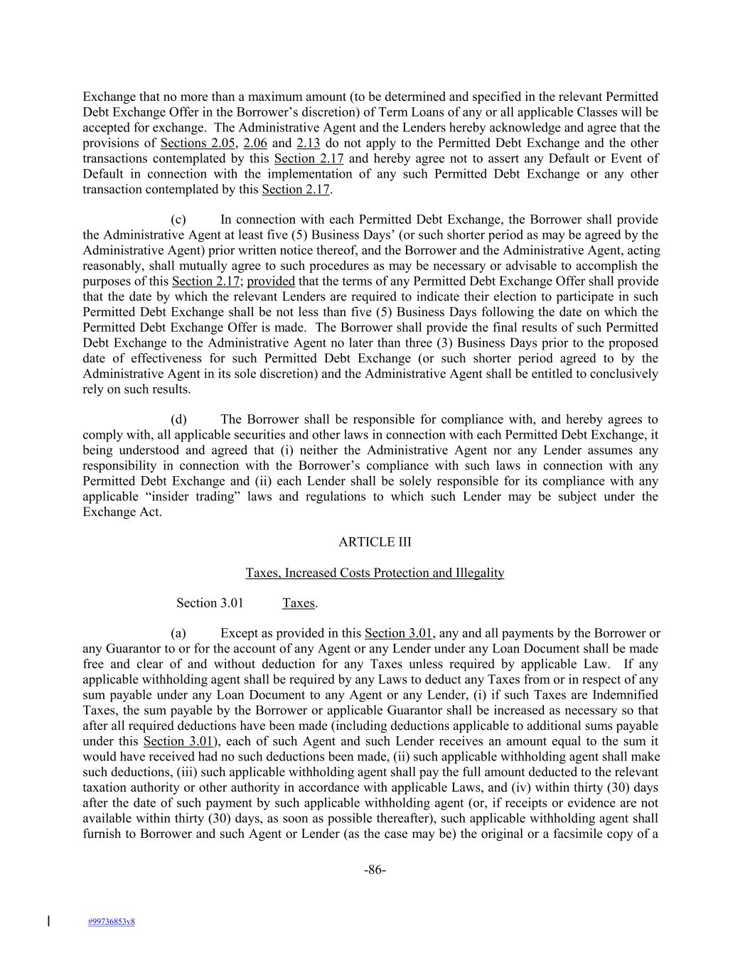 Exchange that no more than a maximum amount (to be determined and specified in the relevant Permitted Debt Exchange Offer in the Borrower’s discretion) of Term Loans of any or all applicable Classes will be accepted for exchange. The Administrative Agent and the Lenders hereby acknowledge and agree that the provisions of Sections 2.05, 2.06 and 2.13 do not apply to the Permitted Debt Exchange and the other transactions contemplated by this Section 2.17 and hereby agree not to assert any Default or Event of Default in connection with the implementation of any such Permitted Debt Exchange or any other transaction contemplated by this Section 2.17. (c) In connection with each Permitted Debt Exchange, the Borrower shall provide the Administrative Agent at least five (5) Business Days’ (or such shorter period as may be agreed by the Administrative Agent) prior written notice thereof, and the Borrower and the Administrative Agent, acting reasonably, shall mutually agree to such procedures as may be necessary or advisable to accomplish the purposes of this Section 2.17; provided that the terms of any Permitted Debt Exchange Offer shall provide that the date by which the relevant Lenders are required to indicate their election to participate in such Permitted Debt Exchange shall be not less than five (5) Business Days following the date on which the Permitted Debt Exchange Offer is made. The Borrower shall provide the final results of such Permitted Debt Exchange to the Administrative Agent no later than three (3) Business Days prior to the proposed date of effectiveness for such Permitted Debt Exchange (or such shorter period agreed to by the Administrative Agent in its sole discretion) and the Administrative Agent shall be entitled to conclusively rely on such results. (d) The Borrower shall be responsible for compliance with, and hereby agrees to comply with, all applicable securities and other laws in connection with each Permitted Debt Exchange, it being understood and agreed that (i) neither the Administrative Agent nor any Lender assumes any responsibility in connection with the Borrower’s compliance with such laws in connection with any Permitted Debt Exchange and (ii) each Lender shall be solely responsible for its compliance with any applicable “insider trading” laws and regulations to which such Lender may be subject under the Exchange Act. ARTICLE III Taxes, Increased Costs Protection and Illegality Section 3.01 Taxes. (a) Except as provided in this Section 3.01, any and all payments by the Borrower or any Guarantor to or for the account of any Agent or any Lender under any Loan Document shall be made free and clear of and without deduction for any Taxes unless required by applicable Law. If any applicable withholding agent shall be required by any Laws to deduct any Taxes from or in respect of any sum payable under any Loan Document to any Agent or any Lender, (i) if such Taxes are Indemnified Taxes, the sum payable by the Borrower or applicable Guarantor shall be increased as necessary so that after all required deductions have been made (including deductions applicable to additional sums payable under this Section 3.01), each of such Agent and such Lender receives an amount equal to the sum it would have received had no such deductions been made, (ii) such applicable withholding agent shall make such deductions, (iii) such applicable withholding agent shall pay the full amount deducted to the relevant taxation authority or other authority in accordance with applicable Laws, and (iv) within thirty (30) days after the date of such payment by such applicable withholding agent (or, if receipts or evidence are not available within thirty (30) days, as soon as possible thereafter), such applicable withholding agent shall furnish to Borrower and such Agent or Lender (as the case may be) the original or a facsimile copy of a -86- #99736853v8