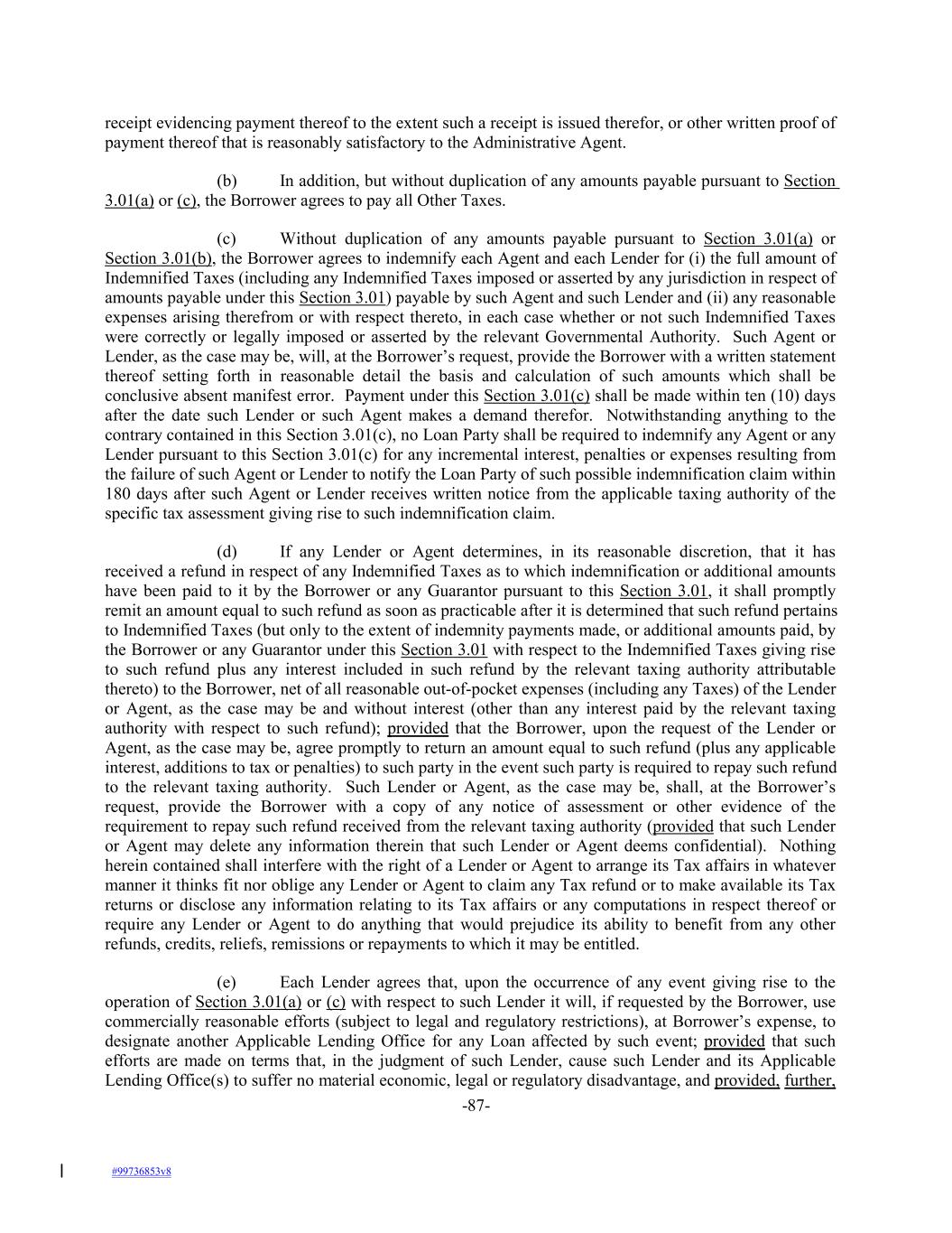 receipt evidencing payment thereof to the extent such a receipt is issued therefor, or other written proof of payment thereof that is reasonably satisfactory to the Administrative Agent. (b) In addition, but without duplication of any amounts payable pursuant to Section 3.01(a) or (c), the Borrower agrees to pay all Other Taxes. (c) Without duplication of any amounts payable pursuant to Section 3.01(a) or Section 3.01(b), the Borrower agrees to indemnify each Agent and each Lender for (i) the full amount of Indemnified Taxes (including any Indemnified Taxes imposed or asserted by any jurisdiction in respect of amounts payable under this Section 3.01) payable by such Agent and such Lender and (ii) any reasonable expenses arising therefrom or with respect thereto, in each case whether or not such Indemnified Taxes were correctly or legally imposed or asserted by the relevant Governmental Authority. Such Agent or Lender, as the case may be, will, at the Borrower’s request, provide the Borrower with a written statement thereof setting forth in reasonable detail the basis and calculation of such amounts which shall be conclusive absent manifest error. Payment under this Section 3.01(c) shall be made within ten (10) days after the date such Lender or such Agent makes a demand therefor. Notwithstanding anything to the contrary contained in this Section 3.01(c), no Loan Party shall be required to indemnify any Agent or any Lender pursuant to this Section 3.01(c) for any incremental interest, penalties or expenses resulting from the failure of such Agent or Lender to notify the Loan Party of such possible indemnification claim within 180 days after such Agent or Lender receives written notice from the applicable taxing authority of the specific tax assessment giving rise to such indemnification claim. (d) If any Lender or Agent determines, in its reasonable discretion, that it has received a refund in respect of any Indemnified Taxes as to which indemnification or additional amounts have been paid to it by the Borrower or any Guarantor pursuant to this Section 3.01, it shall promptly remit an amount equal to such refund as soon as practicable after it is determined that such refund pertains to Indemnified Taxes (but only to the extent of indemnity payments made, or additional amounts paid, by the Borrower or any Guarantor under this Section 3.01 with respect to the Indemnified Taxes giving rise to such refund plus any interest included in such refund by the relevant taxing authority attributable thereto) to the Borrower, net of all reasonable out-of-pocket expenses (including any Taxes) of the Lender or Agent, as the case may be and without interest (other than any interest paid by the relevant taxing authority with respect to such refund); provided that the Borrower, upon the request of the Lender or Agent, as the case may be, agree promptly to return an amount equal to such refund (plus any applicable interest, additions to tax or penalties) to such party in the event such party is required to repay such refund to the relevant taxing authority. Such Lender or Agent, as the case may be, shall, at the Borrower’s request, provide the Borrower with a copy of any notice of assessment or other evidence of the requirement to repay such refund received from the relevant taxing authority (provided that such Lender or Agent may delete any information therein that such Lender or Agent deems confidential). Nothing herein contained shall interfere with the right of a Lender or Agent to arrange its Tax affairs in whatever manner it thinks fit nor oblige any Lender or Agent to claim any Tax refund or to make available its Tax returns or disclose any information relating to its Tax affairs or any computations in respect thereof or require any Lender or Agent to do anything that would prejudice its ability to benefit from any other refunds, credits, reliefs, remissions or repayments to which it may be entitled. (e) Each Lender agrees that, upon the occurrence of any event giving rise to the operation of Section 3.01(a) or (c) with respect to such Lender it will, if requested by the Borrower, use commercially reasonable efforts (subject to legal and regulatory restrictions), at Borrower’s expense, to designate another Applicable Lending Office for any Loan affected by such event; provided that such efforts are made on terms that, in the judgment of such Lender, cause such Lender and its Applicable Lending Office(s) to suffer no material economic, legal or regulatory disadvantage, and provided, further, -87- #99736853v8
