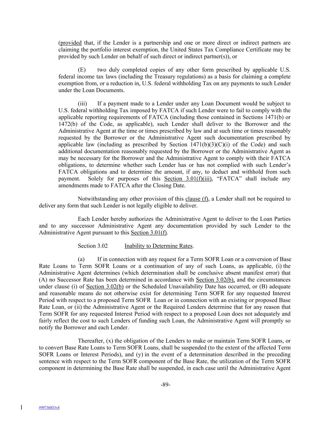 (provided that, if the Lender is a partnership and one or more direct or indirect partners are claiming the portfolio interest exemption, the United States Tax Compliance Certificate may be provided by such Lender on behalf of such direct or indirect partner(s)), or (E) two duly completed copies of any other form prescribed by applicable U.S. federal income tax laws (including the Treasury regulations) as a basis for claiming a complete exemption from, or a reduction in, U.S. federal withholding Tax on any payments to such Lender under the Loan Documents. (iii) If a payment made to a Lender under any Loan Document would be subject to U.S. federal withholding Tax imposed by FATCA if such Lender were to fail to comply with the applicable reporting requirements of FATCA (including those contained in Sections 1471(b) or 1472(b) of the Code, as applicable), such Lender shall deliver to the Borrower and the Administrative Agent at the time or times prescribed by law and at such time or times reasonably requested by the Borrower or the Administrative Agent such documentation prescribed by applicable law (including as prescribed by Section 1471(b)(3)(C)(i) of the Code) and such additional documentation reasonably requested by the Borrower or the Administrative Agent as may be necessary for the Borrower and the Administrative Agent to comply with their FATCA obligations, to determine whether such Lender has or has not complied with such Lender’s FATCA obligations and to determine the amount, if any, to deduct and withhold from such payment. Solely for purposes of this Section 3.01(f)(iii), “FATCA” shall include any amendments made to FATCA after the Closing Date. Notwithstanding any other provision of this clause (f), a Lender shall not be required to deliver any form that such Lender is not legally eligible to deliver. Each Lender hereby authorizes the Administrative Agent to deliver to the Loan Parties and to any successor Administrative Agent any documentation provided by such Lender to the Administrative Agent pursuant to this Section 3.01(f). Section 3.02 Inability to Determine Rates. (a) If in connection with any request for a Term SOFR Loan or a conversion of Base Rate Loans to Term SOFR Loans or a continuation of any of such Loans, as applicable, (i) the Administrative Agent determines (which determination shall be conclusive absent manifest error) that (A) no Successor Rate has been determined in accordance with Section 3.02(b), and the circumstances under clause (i) of Section 3.02(b) or the Scheduled Unavailability Date has occurred, or (B) adequate and reasonable means do not otherwise exist for determining Term SOFR for any requested Interest Period with respect to a proposed Term SOFR Loan or in connection with an existing or proposed Base Rate Loan, or (ii) the Administrative Agent or the Required Lenders determine that for any reason that Term SOFR for any requested Interest Period with respect to a proposed Loan does not adequately and fairly reflect the cost to such Lenders of funding such Loan, the Administrative Agent will promptly so notify the Borrower and each Lender. Thereafter, (x) the obligation of the Lenders to make or maintain Term SOFR Loans, or to convert Base Rate Loans to Term SOFR Loans, shall be suspended (to the extent of the affected Term SOFR Loans or Interest Periods), and (y) in the event of a determination described in the preceding sentence with respect to the Term SOFR component of the Base Rate, the utilization of the Term SOFR component in determining the Base Rate shall be suspended, in each case until the Administrative Agent -89- #99736853v8