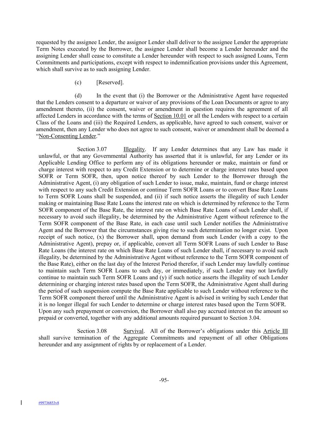 requested by the assignee Lender, the assignor Lender shall deliver to the assignee Lender the appropriate Term Notes executed by the Borrower, the assignee Lender shall become a Lender hereunder and the assigning Lender shall cease to constitute a Lender hereunder with respect to such assigned Loans, Term Commitments and participations, except with respect to indemnification provisions under this Agreement, which shall survive as to such assigning Lender. (c) [Reserved]. (d) In the event that (i) the Borrower or the Administrative Agent have requested that the Lenders consent to a departure or waiver of any provisions of the Loan Documents or agree to any amendment thereto, (ii) the consent, waiver or amendment in question requires the agreement of all affected Lenders in accordance with the terms of Section 10.01 or all the Lenders with respect to a certain Class of the Loans and (iii) the Required Lenders, as applicable, have agreed to such consent, waiver or amendment, then any Lender who does not agree to such consent, waiver or amendment shall be deemed a “Non-Consenting Lender.” Section 3.07 Illegality. If any Lender determines that any Law has made it unlawful, or that any Governmental Authority has asserted that it is unlawful, for any Lender or its Applicable Lending Office to perform any of its obligations hereunder or make, maintain or fund or charge interest with respect to any Credit Extension or to determine or charge interest rates based upon SOFR or Term SOFR, then, upon notice thereof by such Lender to the Borrower through the Administrative Agent, (i) any obligation of such Lender to issue, make, maintain, fund or charge interest with respect to any such Credit Extension or continue Term SOFR Loans or to convert Base Rate Loans to Term SOFR Loans shall be suspended, and (ii) if such notice asserts the illegality of such Lender making or maintaining Base Rate Loans the interest rate on which is determined by reference to the Term SOFR component of the Base Rate, the interest rate on which Base Rate Loans of such Lender shall, if necessary to avoid such illegality, be determined by the Administrative Agent without reference to the Term SOFR component of the Base Rate, in each case until such Lender notifies the Administrative Agent and the Borrower that the circumstances giving rise to such determination no longer exist. Upon receipt of such notice, (x) the Borrower shall, upon demand from such Lender (with a copy to the Administrative Agent), prepay or, if applicable, convert all Term SOFR Loans of such Lender to Base Rate Loans (the interest rate on which Base Rate Loans of such Lender shall, if necessary to avoid such illegality, be determined by the Administrative Agent without reference to the Term SOFR component of the Base Rate), either on the last day of the Interest Period therefor, if such Lender may lawfully continue to maintain such Term SOFR Loans to such day, or immediately, if such Lender may not lawfully continue to maintain such Term SOFR Loans and (y) if such notice asserts the illegality of such Lender determining or charging interest rates based upon the Term SOFR, the Administrative Agent shall during the period of such suspension compute the Base Rate applicable to such Lender without reference to the Term SOFR component thereof until the Administrative Agent is advised in writing by such Lender that it is no longer illegal for such Lender to determine or charge interest rates based upon the Term SOFR. Upon any such prepayment or conversion, the Borrower shall also pay accrued interest on the amount so prepaid or converted, together with any additional amounts required pursuant to Section 3.04. Section 3.08 Survival. All of the Borrower’s obligations under this Article III shall survive termination of the Aggregate Commitments and repayment of all other Obligations hereunder and any assignment of rights by or replacement of a Lender. -95- #99736853v8