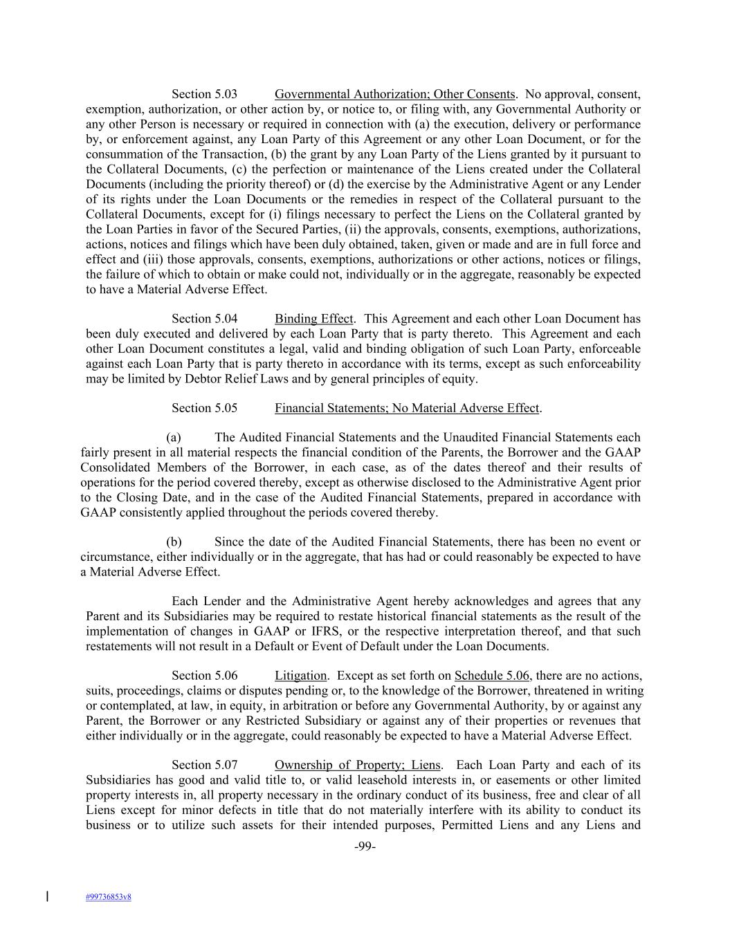 Section 5.03 Governmental Authorization; Other Consents. No approval, consent, exemption, authorization, or other action by, or notice to, or filing with, any Governmental Authority or any other Person is necessary or required in connection with (a) the execution, delivery or performance by, or enforcement against, any Loan Party of this Agreement or any other Loan Document, or for the consummation of the Transaction, (b) the grant by any Loan Party of the Liens granted by it pursuant to the Collateral Documents, (c) the perfection or maintenance of the Liens created under the Collateral Documents (including the priority thereof) or (d) the exercise by the Administrative Agent or any Lender of its rights under the Loan Documents or the remedies in respect of the Collateral pursuant to the Collateral Documents, except for (i) filings necessary to perfect the Liens on the Collateral granted by the Loan Parties in favor of the Secured Parties, (ii) the approvals, consents, exemptions, authorizations, actions, notices and filings which have been duly obtained, taken, given or made and are in full force and effect and (iii) those approvals, consents, exemptions, authorizations or other actions, notices or filings, the failure of which to obtain or make could not, individually or in the aggregate, reasonably be expected to have a Material Adverse Effect. Section 5.04 Binding Effect. This Agreement and each other Loan Document has been duly executed and delivered by each Loan Party that is party thereto. This Agreement and each other Loan Document constitutes a legal, valid and binding obligation of such Loan Party, enforceable against each Loan Party that is party thereto in accordance with its terms, except as such enforceability may be limited by Debtor Relief Laws and by general principles of equity. Section 5.05 Financial Statements; No Material Adverse Effect. (a) The Audited Financial Statements and the Unaudited Financial Statements each fairly present in all material respects the financial condition of the Parents, the Borrower and the GAAP Consolidated Members of the Borrower, in each case, as of the dates thereof and their results of operations for the period covered thereby, except as otherwise disclosed to the Administrative Agent prior to the Closing Date, and in the case of the Audited Financial Statements, prepared in accordance with GAAP consistently applied throughout the periods covered thereby. (b) Since the date of the Audited Financial Statements, there has been no event or circumstance, either individually or in the aggregate, that has had or could reasonably be expected to have a Material Adverse Effect. Each Lender and the Administrative Agent hereby acknowledges and agrees that any Parent and its Subsidiaries may be required to restate historical financial statements as the result of the implementation of changes in GAAP or IFRS, or the respective interpretation thereof, and that such restatements will not result in a Default or Event of Default under the Loan Documents. Section 5.06 Litigation. Except as set forth on Schedule 5.06, there are no actions, suits, proceedings, claims or disputes pending or, to the knowledge of the Borrower, threatened in writing or contemplated, at law, in equity, in arbitration or before any Governmental Authority, by or against any Parent, the Borrower or any Restricted Subsidiary or against any of their properties or revenues that either individually or in the aggregate, could reasonably be expected to have a Material Adverse Effect. Section 5.07 Ownership of Property; Liens. Each Loan Party and each of its Subsidiaries has good and valid title to, or valid leasehold interests in, or easements or other limited property interests in, all property necessary in the ordinary conduct of its business, free and clear of all Liens except for minor defects in title that do not materially interfere with its ability to conduct its business or to utilize such assets for their intended purposes, Permitted Liens and any Liens and -99- #99736853v8